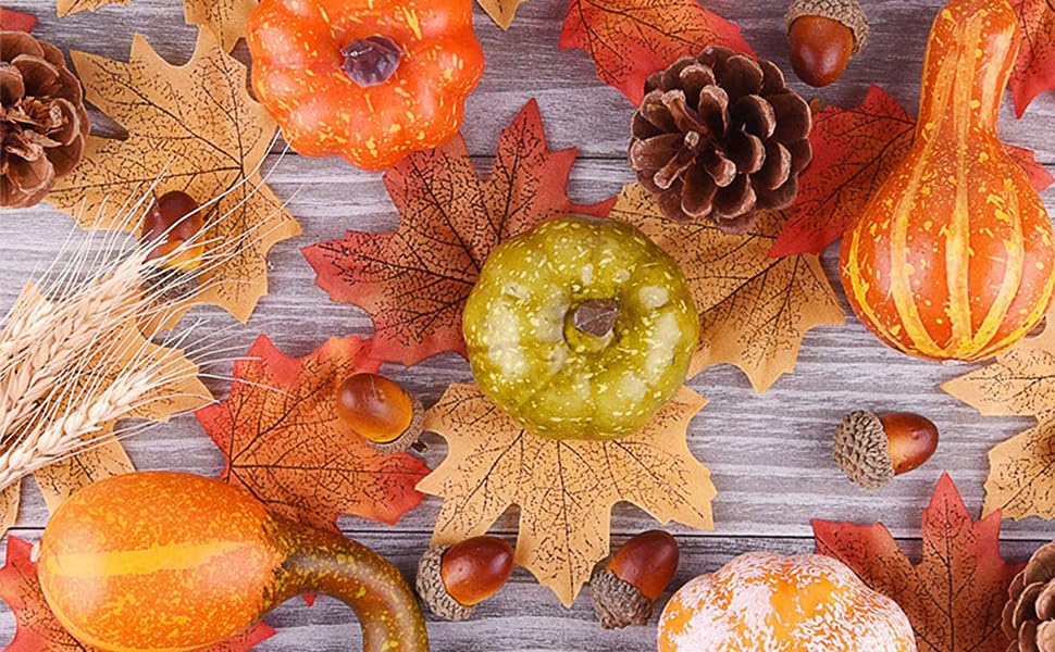 【 本物そっくり高品質素材】各パックには異なるサイズのカボチャなどが入っており、祝日と季節の要素でいっぱいです。フェスティバルや集まりの場に心地よく幸せな雰囲気を演出します。それらはまるで庭から採れたかのように見え、実物そっくりで腐敗することはありません。一度手に取ってみると、まとめて飾るとハロウィンや秋の雰囲気がたっぷり楽しめます!