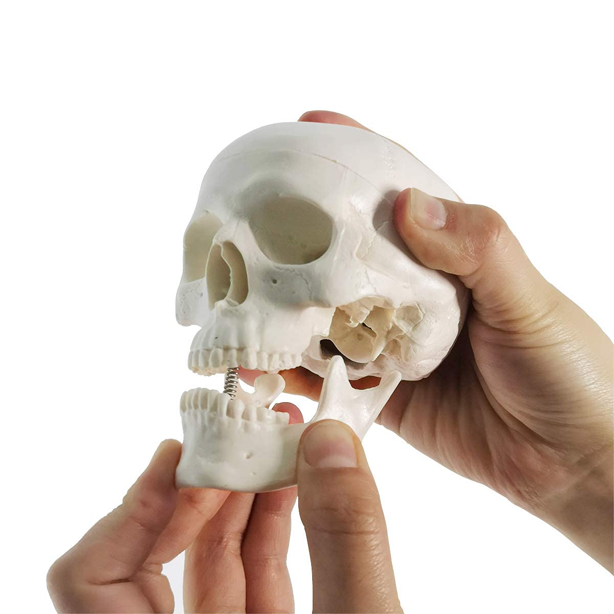 √ High Quality➤ Non-toxic durable PVC material, easy to clean. The spring is sturdy and the jaw is firmly held in place with no loose action in the movement. Easy to remove the spring with one screw. Size: 3.9*2.75*3.9 inch. √ Anatomical Skull Model ➤ This 3 parts mini human skull has every detail that the big models have, including the holes, sockets, canals, and a complete set of human teeth. It also shows the bones structure, texture, articulating mandible, eye sockets, sutures, internal nasal cavity, and the endocranium cavity. √ Great For Study ➤ Palm-sized designed to better learn about the human skull and be lighter, smaller and easier to move and carry. The calvaria is detachable as well to deeper look into the skull bone model and study. √ Multiple Uses ➤ This model is a great teaching aid for anatomy and physiology courses; also a great human skull model for kids learning.You can set off the atmosphere, as a collection decoration for your gothic style room, or give your friend who likes the skeleton, are the best choice. √ Multiple scenarios ➤ For school teaching, learning, researching display tool and lab ornament supplies.it can also help with designing and printing fun decoration such as Halloween decorations,pirate themed decorations,etc.