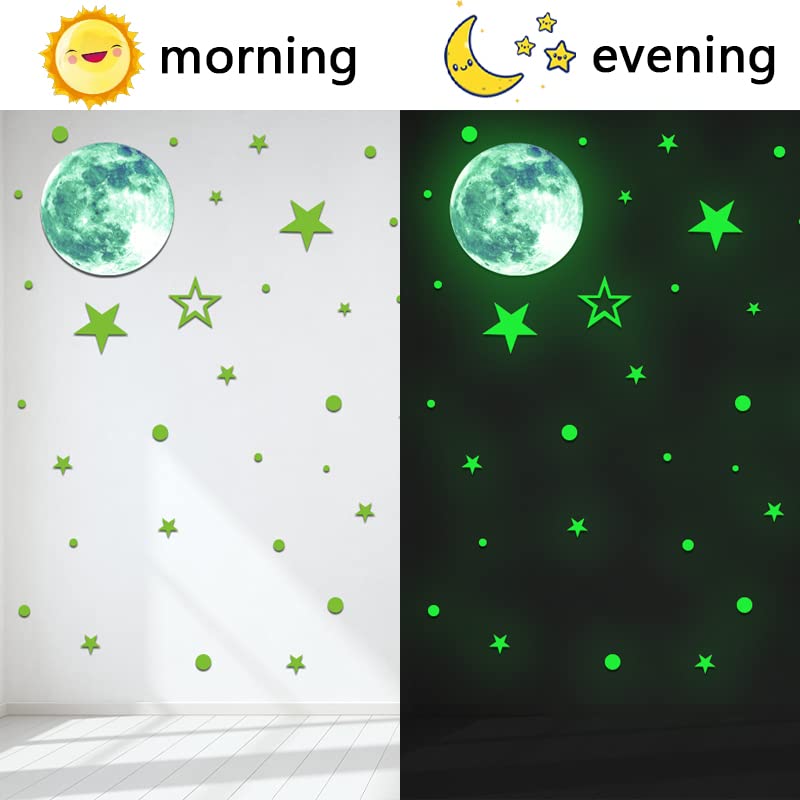 【グリーンの月と星々のアクセサリー】ステッカーには、すばらしい星々と大きさ20cmの月が含まれていて、リアルな星空を体験させてくれます。光が当たる場所で光を吸収させると、暗い中でも発光します。自然に星が煌めく星空で、家の中のお好きな部屋を魅力的に飾れます。