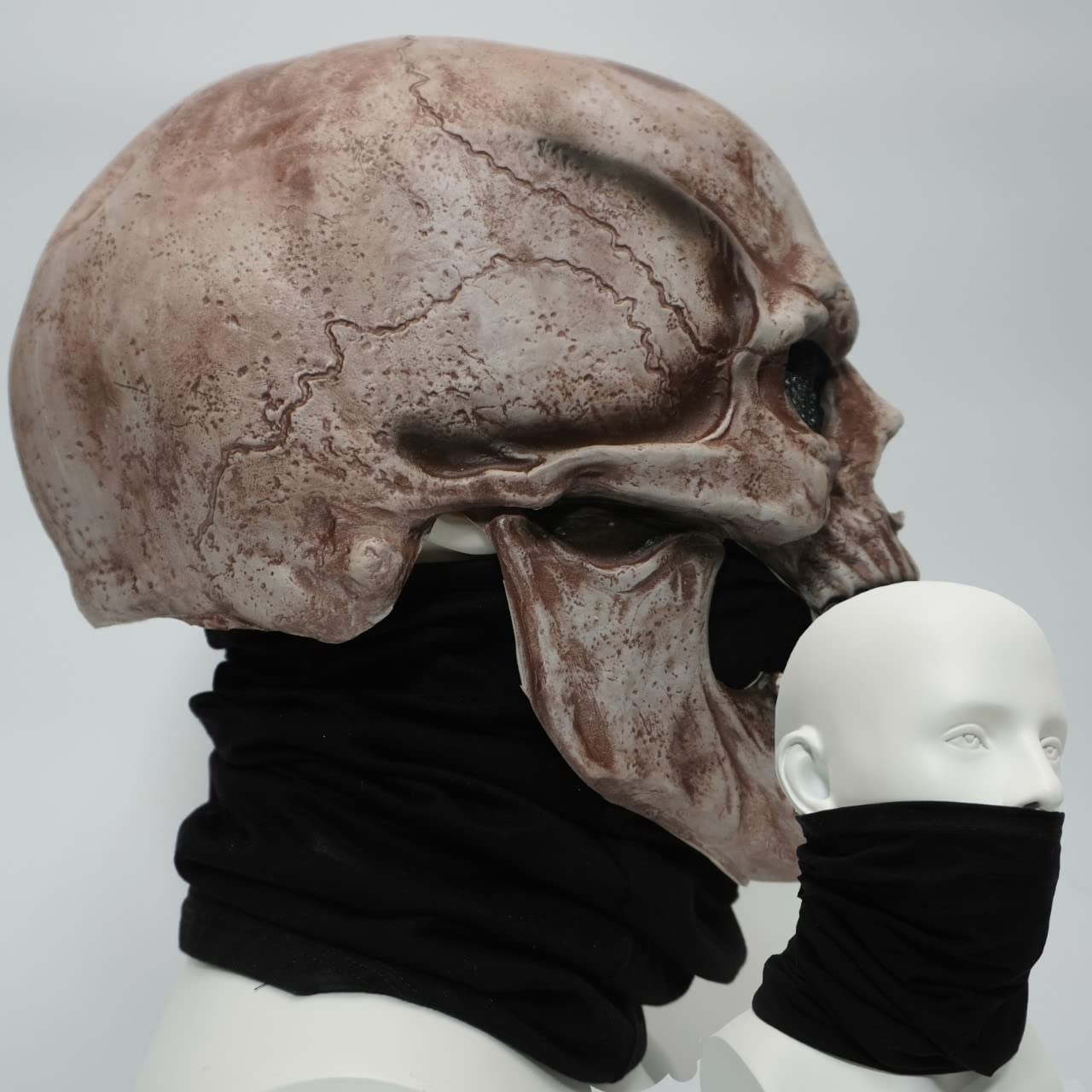 【ご使用における注意事項】ラテックス製の為、特有の匂いがあります。またご自身の顎でガイコツの口を動かす仕様の為、顎がうまく当たらない顔の小さい方はフェイスマスクの下にテッシュ・タオルなどの詰め物をし体積を上げるとうまくガイコツの顎と連動いたします。