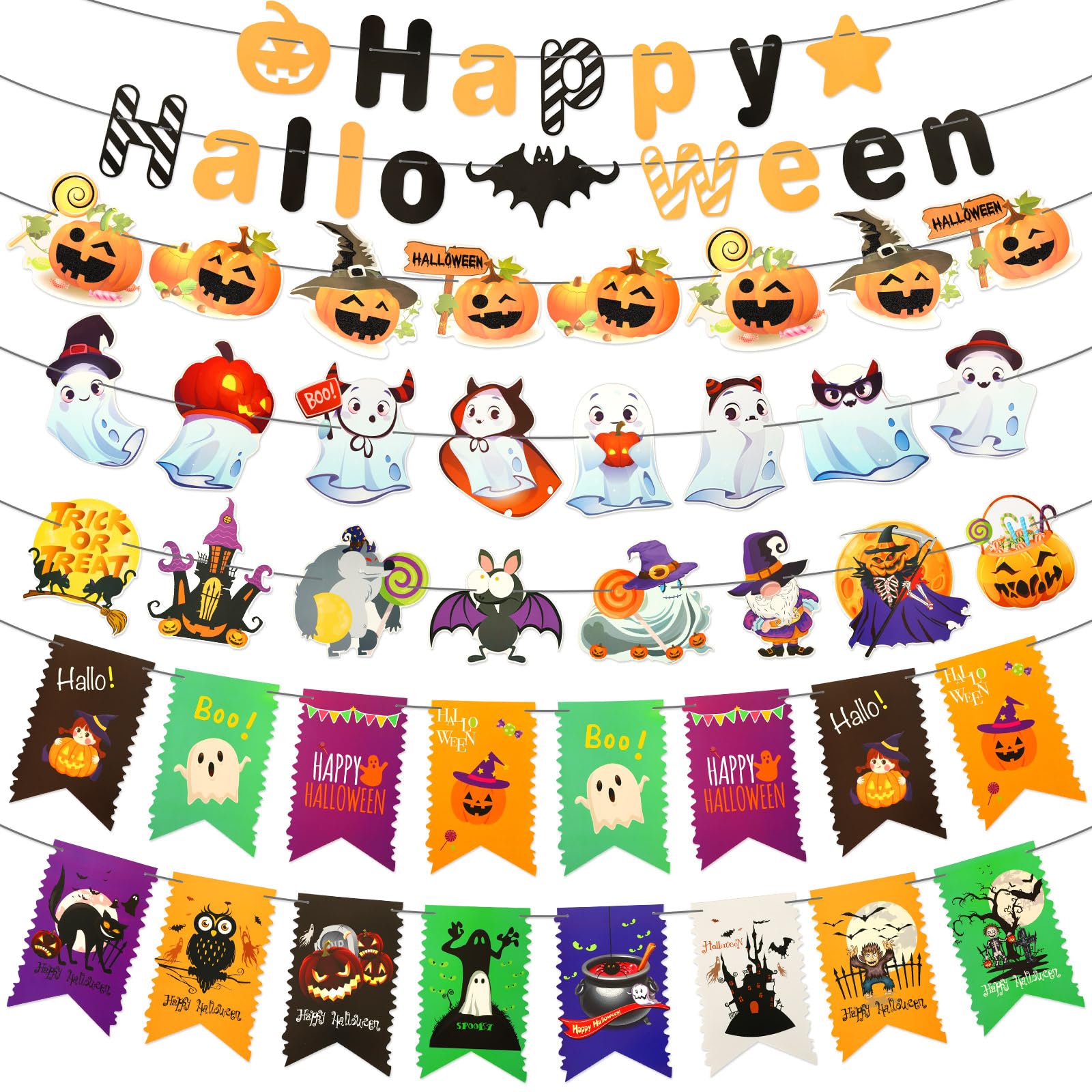 多様なデザイン:ハロウィン 飾り ガーランドセットにはHAPPY HALLOWEEN、ゴースト、カボチャなどのさまざまながデザインが含まれて、魚の尾の形をしたハロウィン ガーランドもあり、自由に使用できます