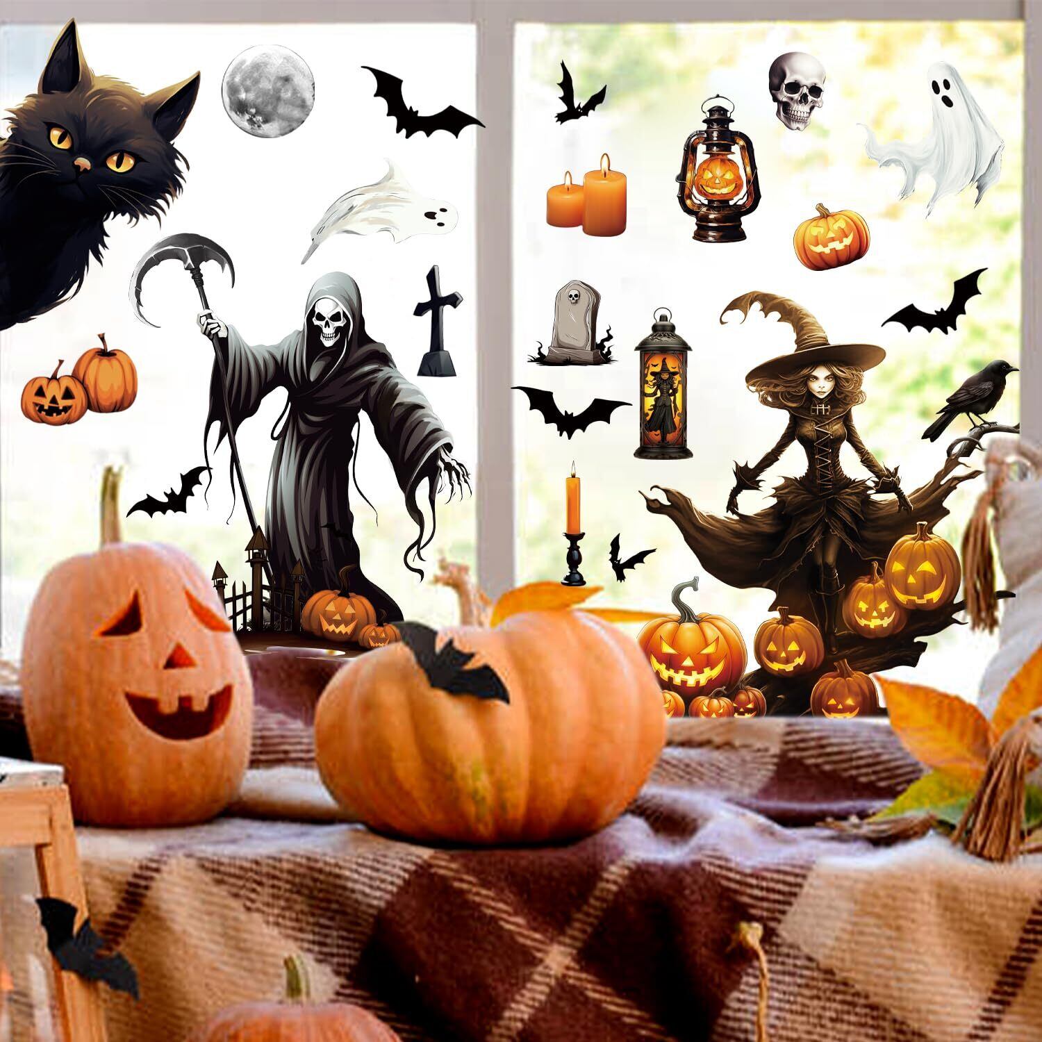 DERAYEE ハロウィン 飾り 静電ステッカー 剥がせる 汚れない 88pcs入り 黒猫 幽霊 月 カボチャジャック どくろ 静電気シール 窓ステッカー 小物 部屋 装飾品 インテリア ガラスに貼るシール