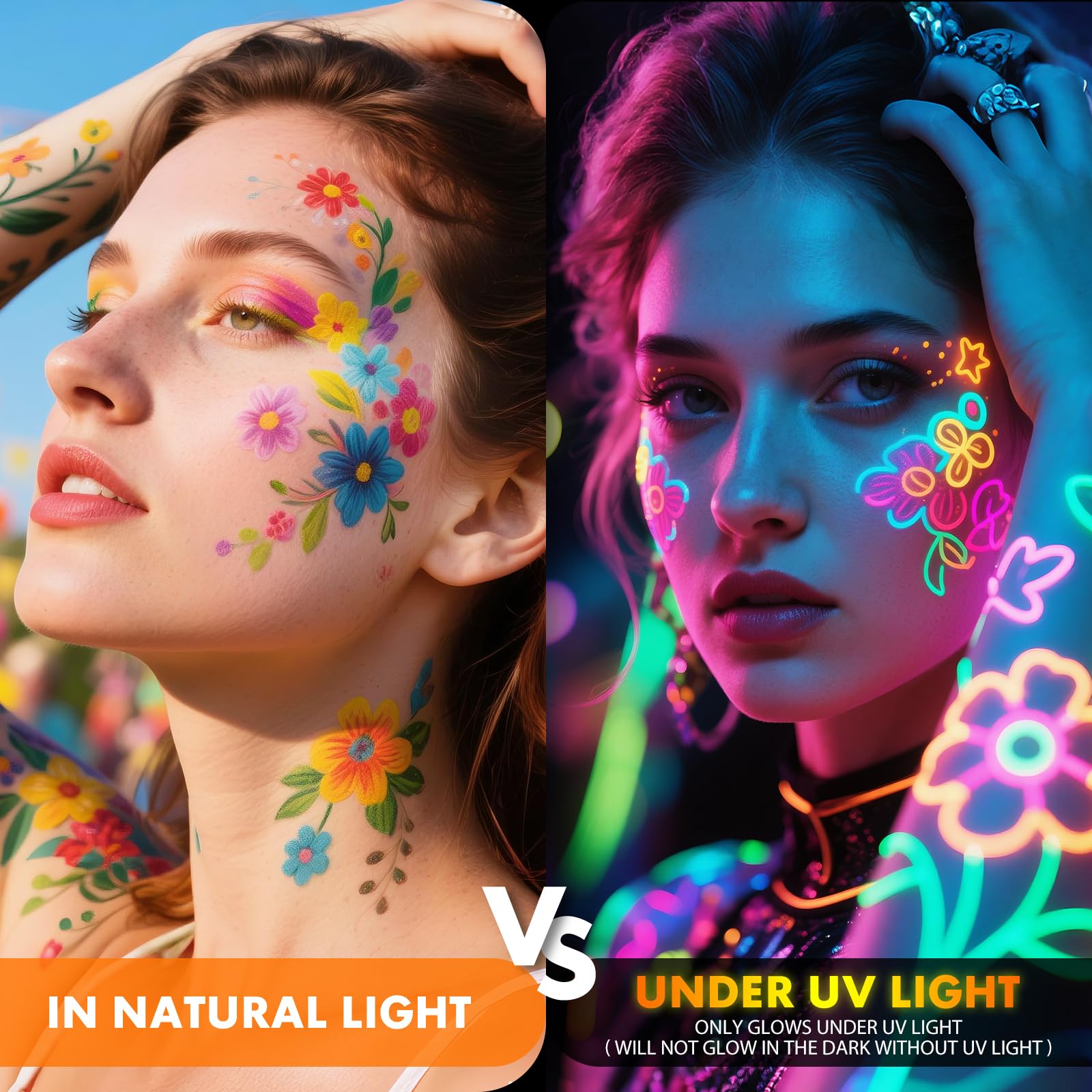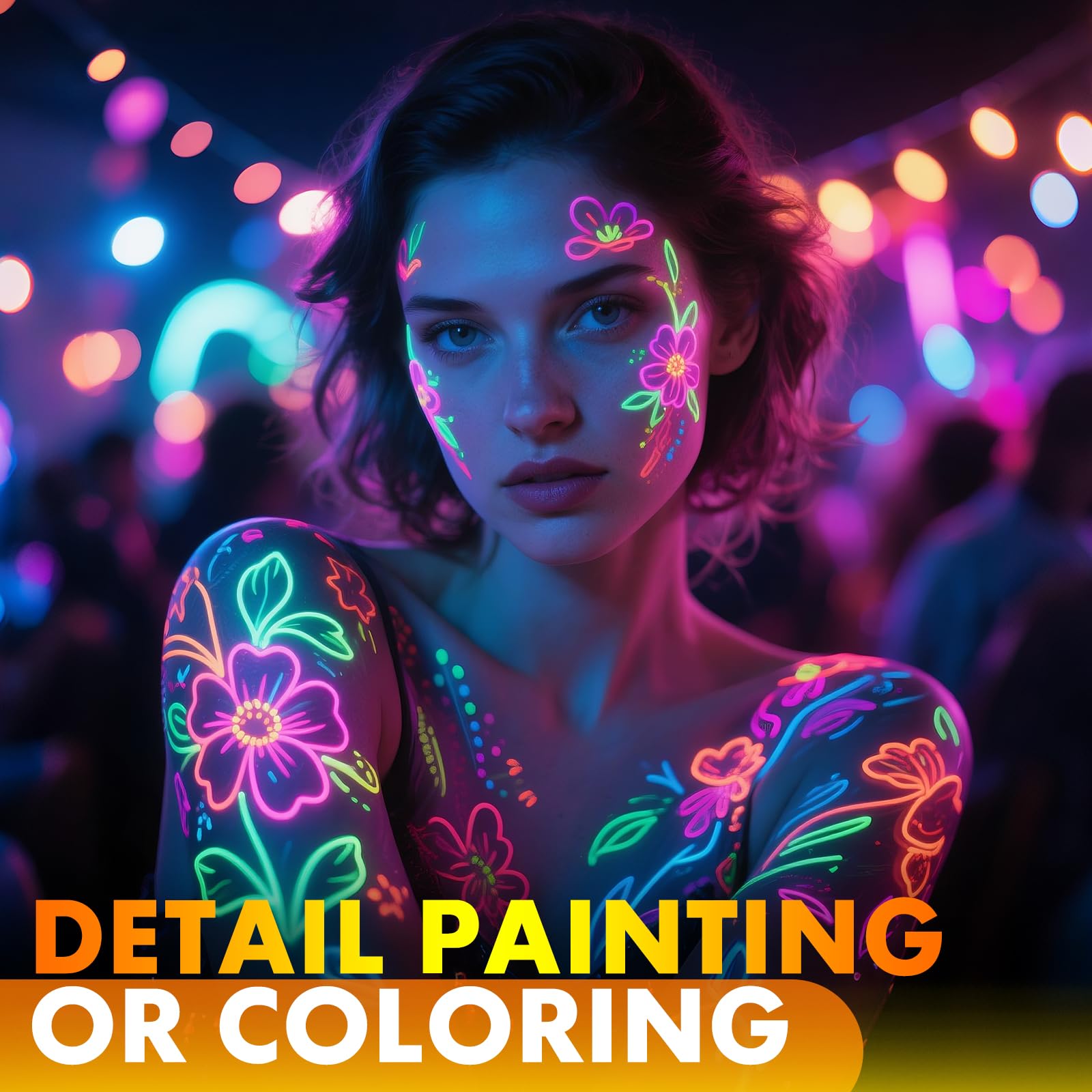 UVライトで光る: このネオン・フェイスペイント・マーカーは、ブラックライトや紫外線の下で、描いたメイクをキラキラと輝かせ、明るく鮮やかな色を表現し、人目を引く効果を生み出します。注:ペン先から液体がにじみ出るのを防ぐため、使用前にペーパータオルで少し液体を拭き取ってください。