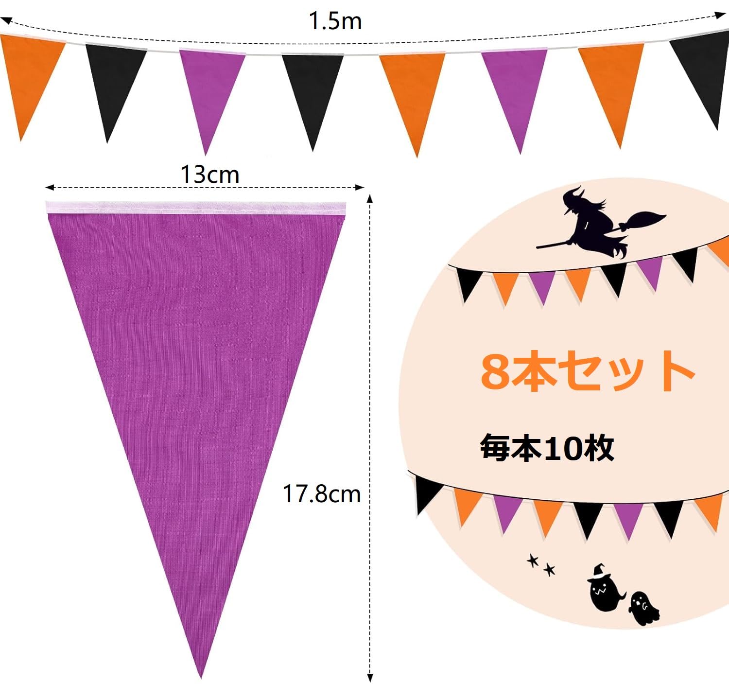 「商品仕様」:セット内容:三角旗ガーランド8本(毎本10枚)、三角旗のサイズ:13cm*17.8cm、全長1.5m/本、素材:紙、色:オレンジ+パープル+ブラック
