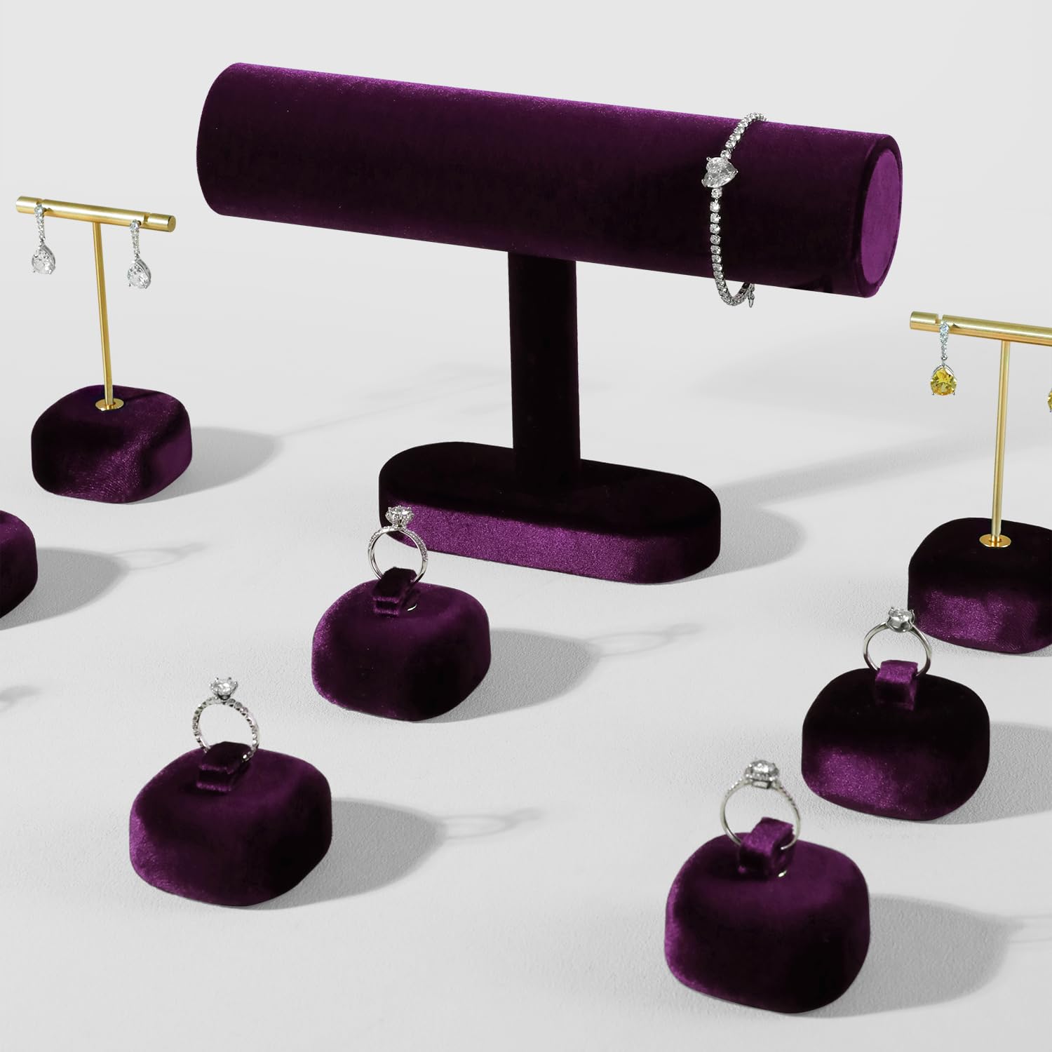 このTバースタンドは弾力性のあるベルベットで包まれており、柔らかく豪華な表面を提供し、時計、ネックレス、ブレスレット、その他の長いジュエリーを展示するのに最適です。 様々なディスプレイの好みに合わせて、ラウンドとセミフラットの2種類のロッドスタイルがあります。 個人のジュエリーコレクション、小売店カウンター、ジュエリー展示会に最適なこのエレガントな作品は、実用性と洗練されたシンプルさを兼ね備えています。