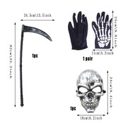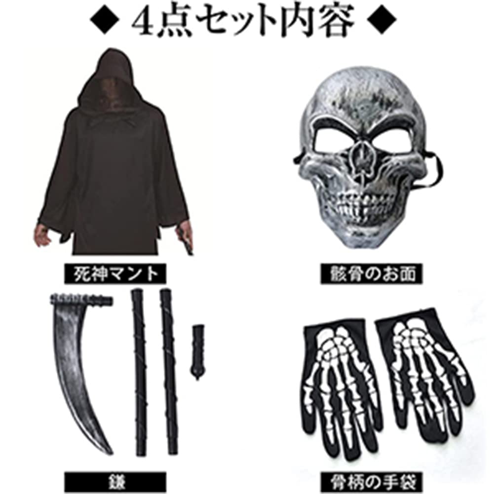 【とってもお得な4点セット】豪華4点セット:①死神コスプレ衣装 、② 鎌(かま)、③ドクロのお面、④骨柄の手袋。コスプレに必要なものが全てセットになっています。リーズナブルな価格と品質のバランスが抜群です。