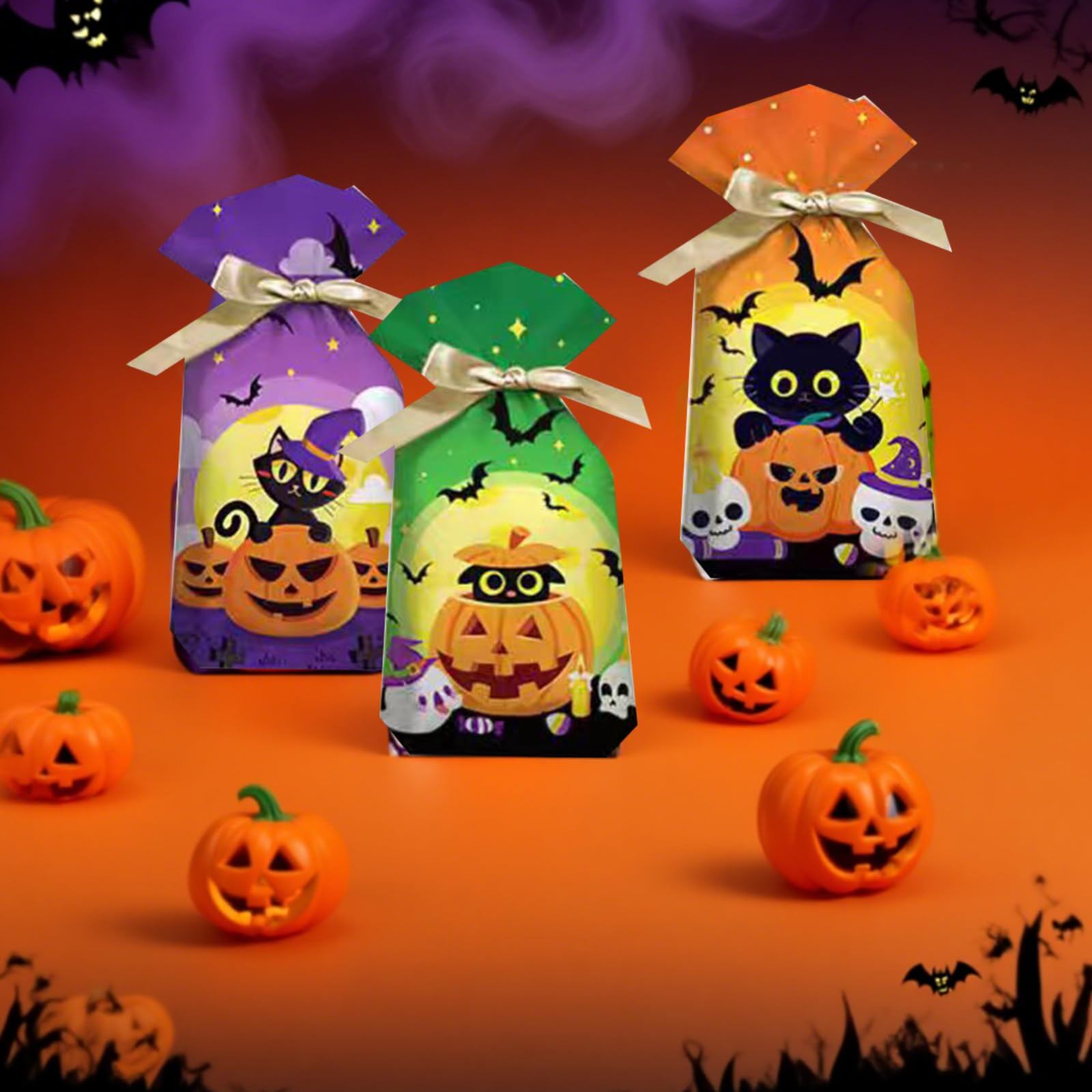 【在庫セール】siawadeky ハロウィン キャンディーバッグ 50枚セット 3種類柄 ラッピング 袋 黑猫 かぼちゃ 幽霊 巾着袋 リボン結び ギフト包装 ハロウィン 巾着ポーチ プレゼント 引き出物袋 キャンディー お菓子 ビスケット 包装用 | asaRulu0511