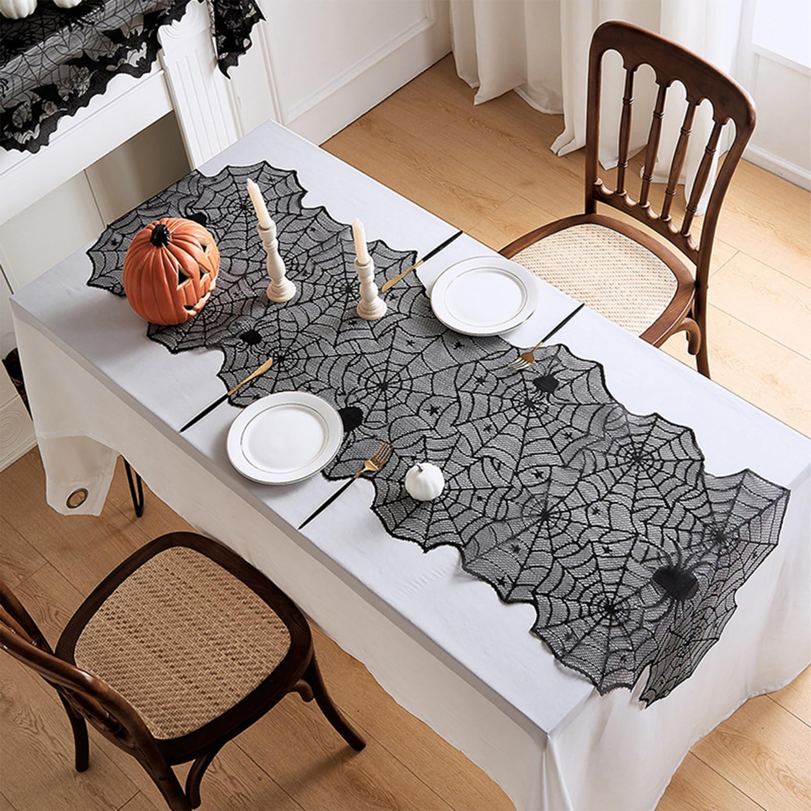 【在庫処分】FINGOOO ハロウィン テーブルランナー クモの巣 飾り オーナメント 飾り付け ブラック おしゃれ レース刺繍 パーティー 食卓 部屋 インテリア お店 暖炉の装飾 46×183cm (ハロウィンA) | asaRulu0511