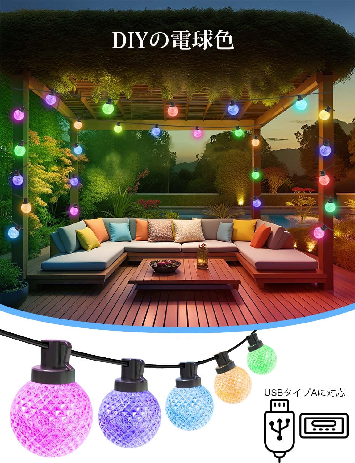 【防雨型・用途広い】IP65防水設計耐水性あり、季節問わず屋内でも屋外でも使えます。ガーデンライト、ベランダ、庭BBQ、テラス、ガゼボ、パーゴラ、パラソル、テントの飾り付け、紙提灯の灯りとしても使用できます。暖色系の明かりがレトロ、おしゃれな感じあり、ムーディな雰囲気作り、一気ににぎやかな空間に変貌できます。夏祭りイベント、屋台飾り、誕生日パーティー、ハロウィン、クリスマスツリー、店舗、カフェでは大活躍します。*注意:USBポートは非防水です。