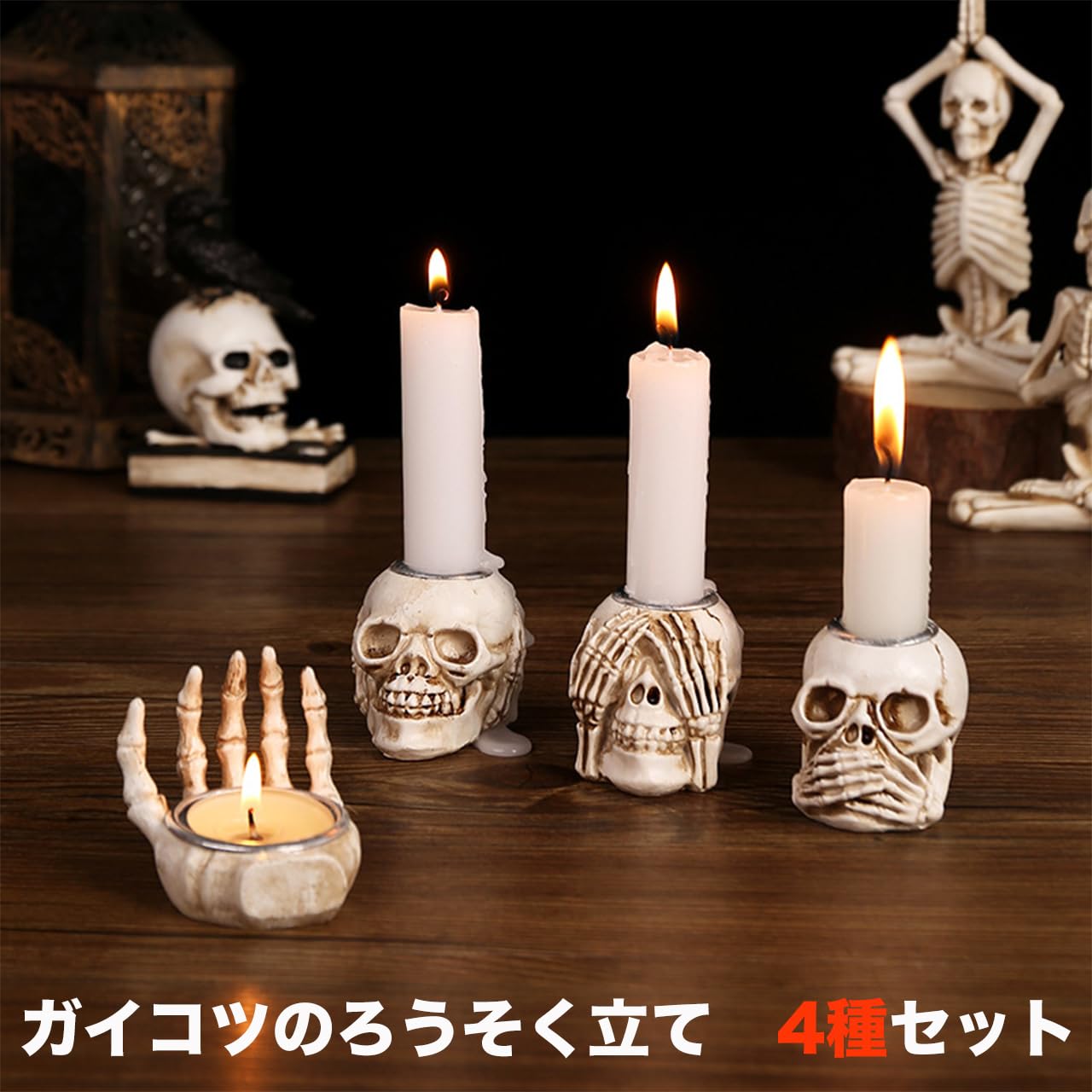 これらのホラーなキャンドルホルダーは、不気味な雰囲気を加えるようにデザインされています。セットには、テーパーキャンドル用のドクロ型ホルダーが3個と、ティーライトキャンドル用のハンド型ホルダーが1個含まれています。ガイコツやホラー愛好家向けに作られたこれらは、ハロウィーンの装飾やお部屋の雰囲気作りに最適なアイテムです。