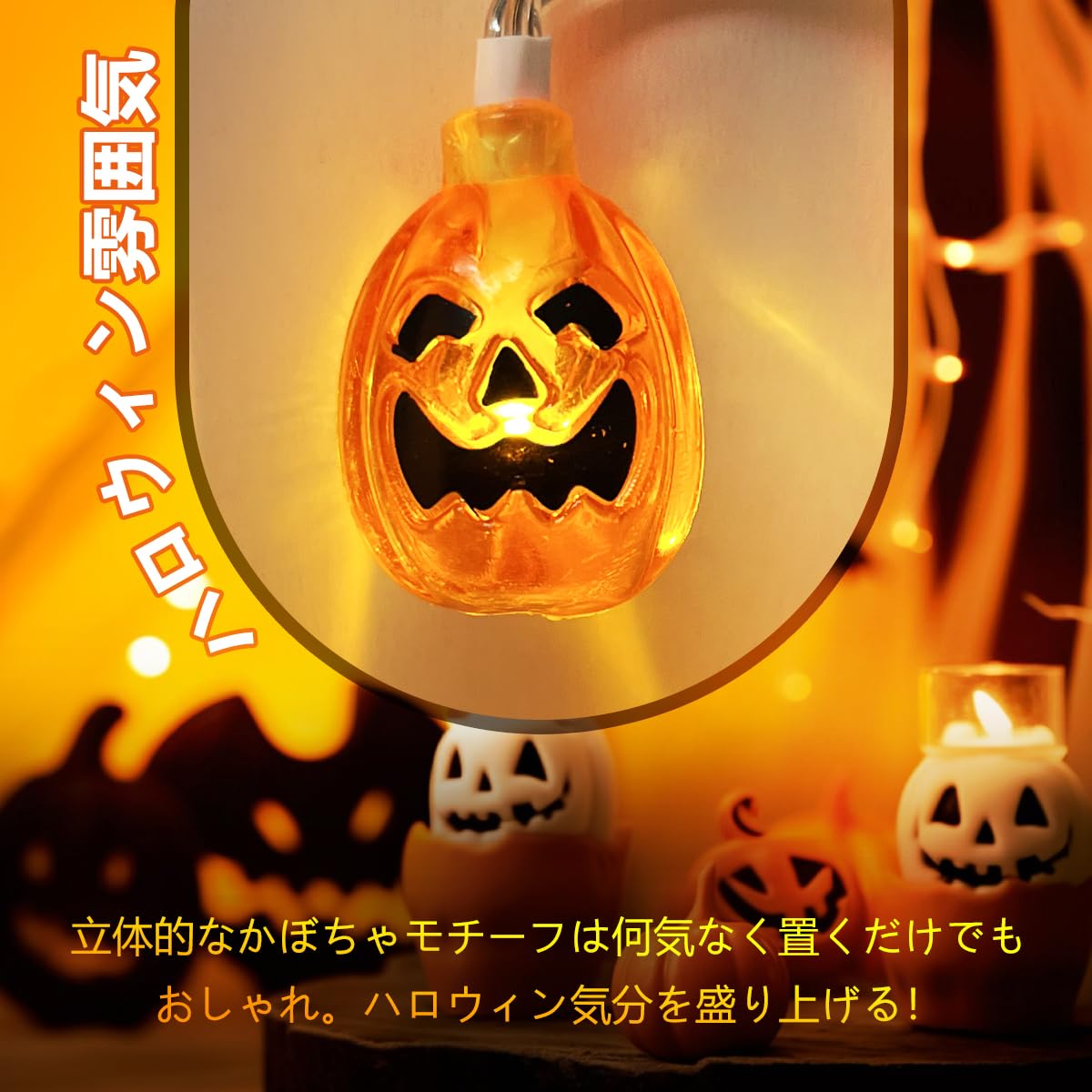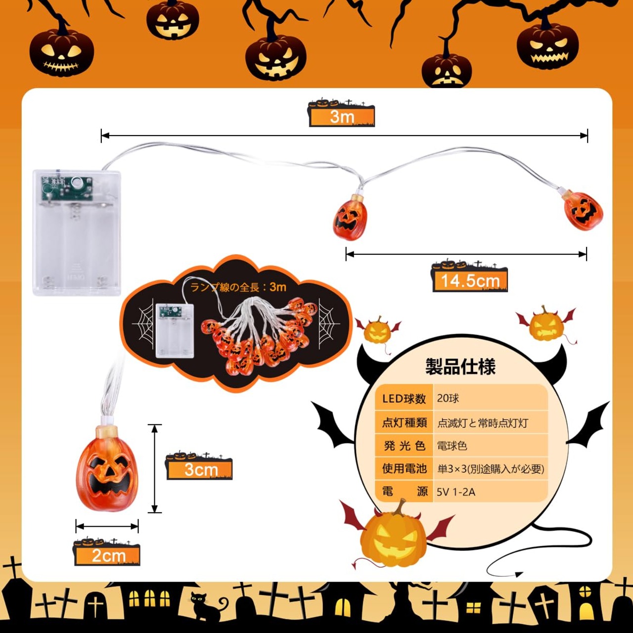 【商品仕様】かぼちゃライト:20LED電球 3m、電池式 常灯と点滅ライト、単三電池*3だけで点灯出来る、使い方が易い、どこにでも簡単に設置できる。ハロウィンに欠かせない装飾!屋外、部屋などに飾ると、幻想的と暖かい神秘的な雰囲気を作り出せます。