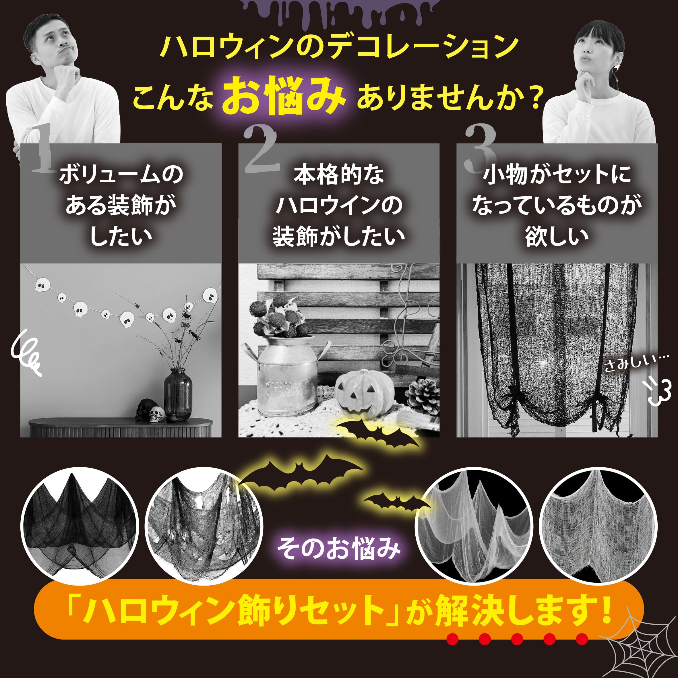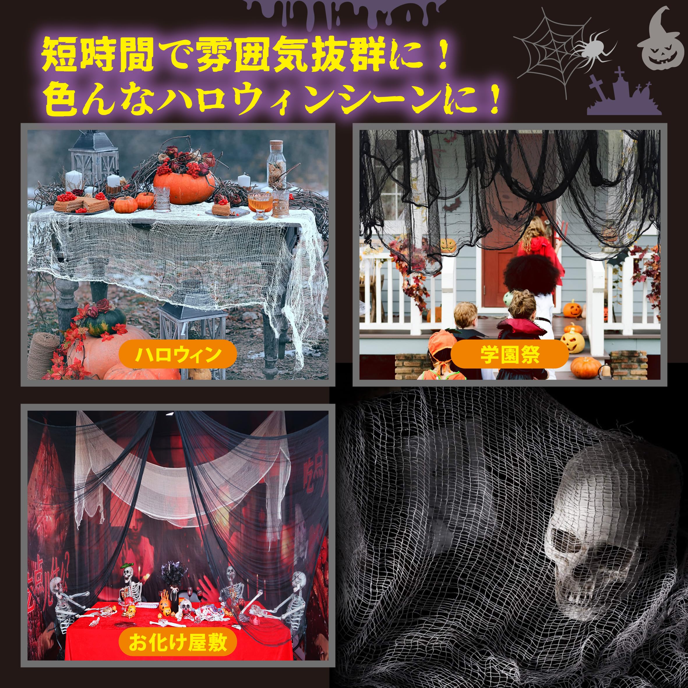 【幅広い用途】この不気味な布は、ハロウィーンパーティーの中心的な装飾として機能します。ハロウィンパーティーのインテリア、蜘蛛の巣、お化け屋敷のインテリア、学園祭に使用することができます。