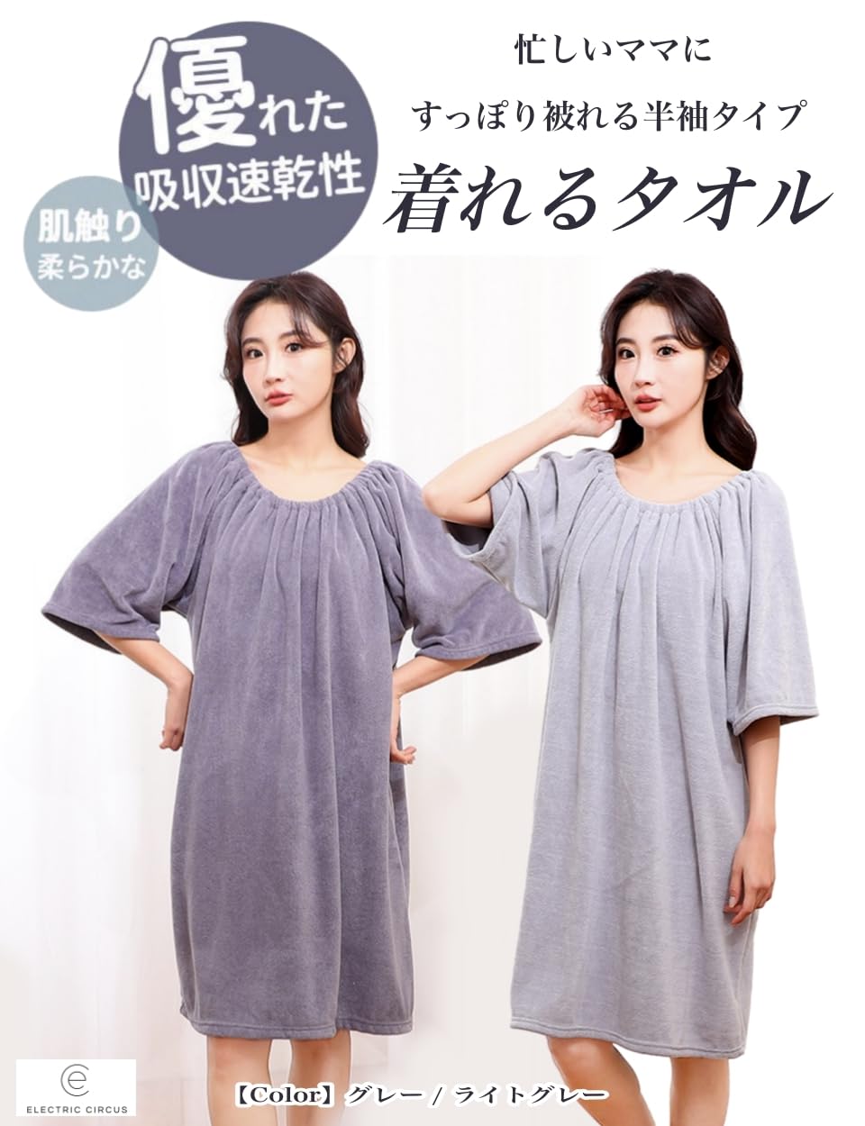 【すっぽりかぶって楽ちん半袖タイプ】お風呂上げりにそのまま部屋着になる楽ちんアイテム・吸水性と速乾性に優れたふわふわやわらかな肌触り・夏に汗が引くのを待たなくても、冬に体を冷やさない便利なアイテム