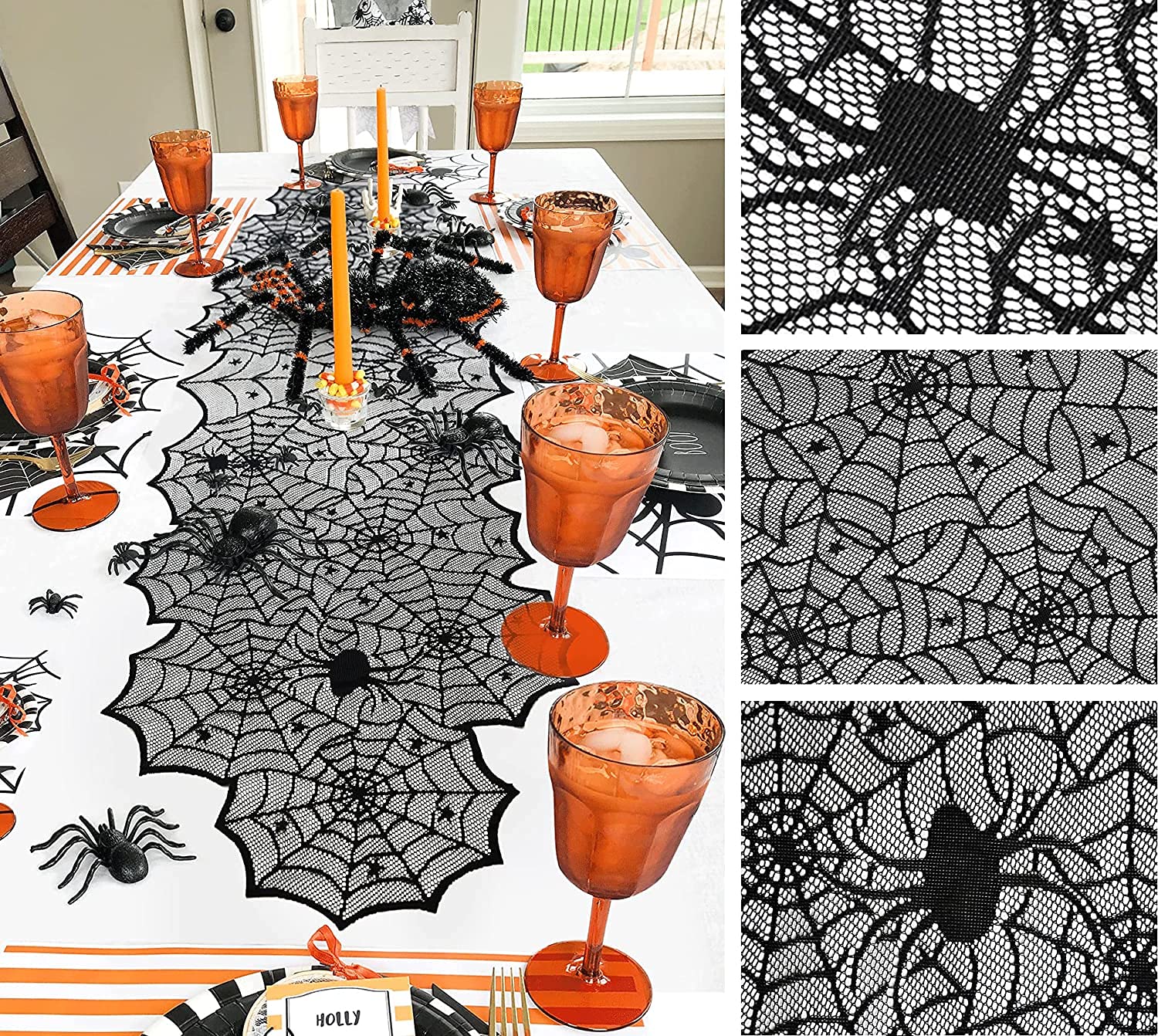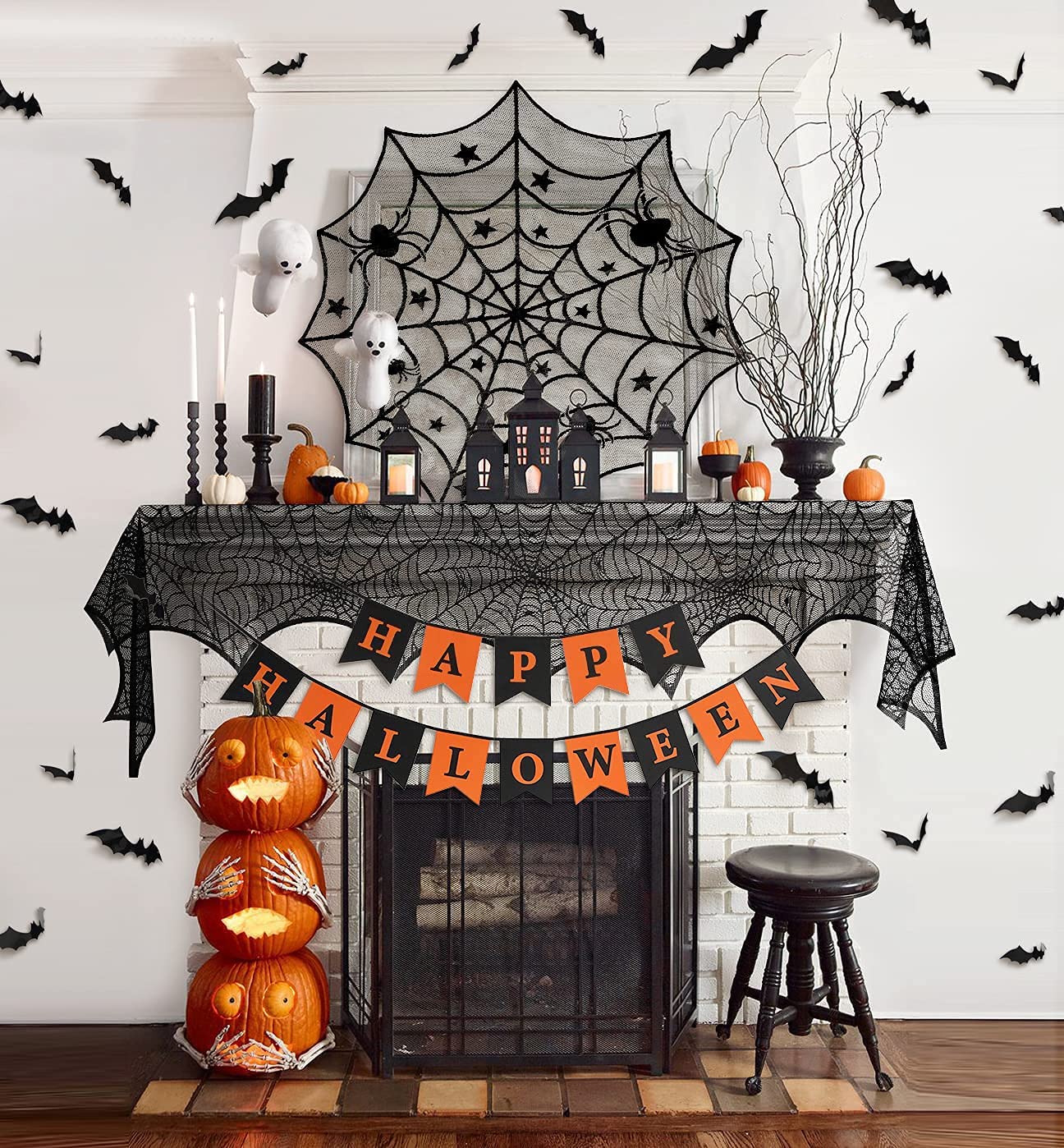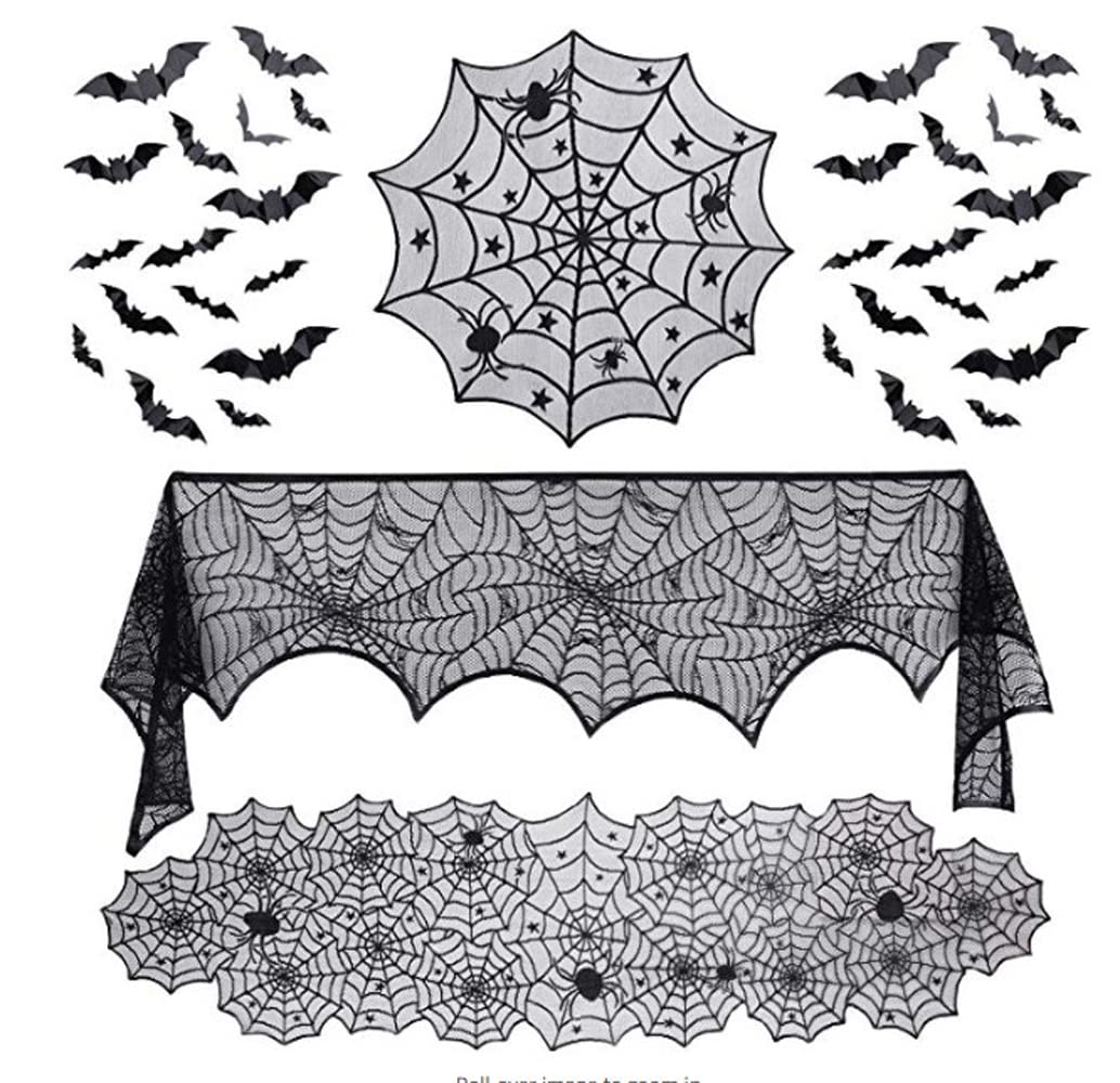 Forhomelife テーブルクロス ハロウィン 飾り 39点セット ブラック テーブルランナー 蜘蛛の巣 レース 大判 ハロウィン コウモリ ステッカー 36枚飾り パーティグッズ インテリア 窓飾り お部屋飾り ハロウィン雑貨 デコレーション