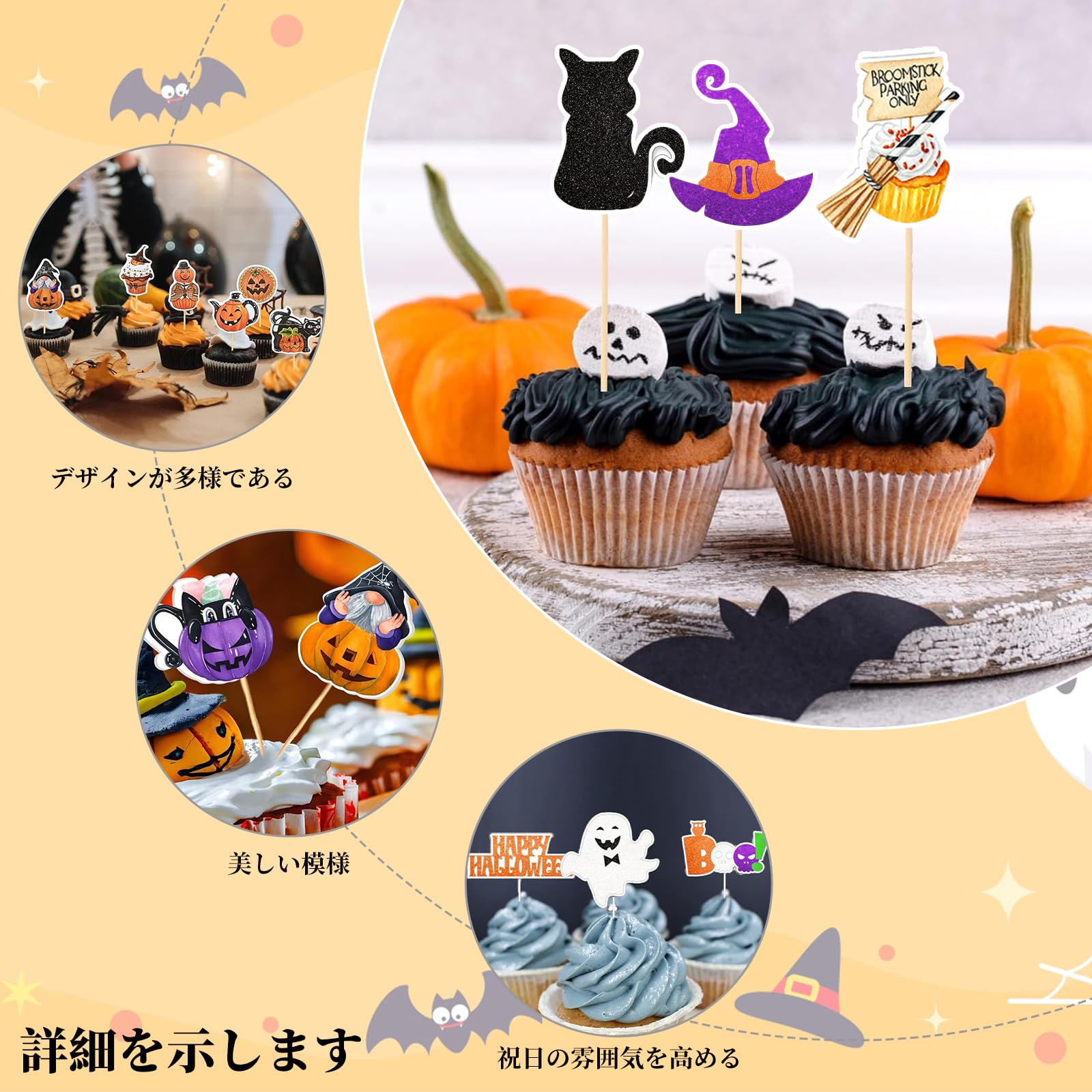 Coollooda ハロウィン ケーキトッパー (28個セット) カップケーキトッパー ケーキ飾り ケーキ挿入カード かぼちゃ お菓子/果物/カップケーキ用
