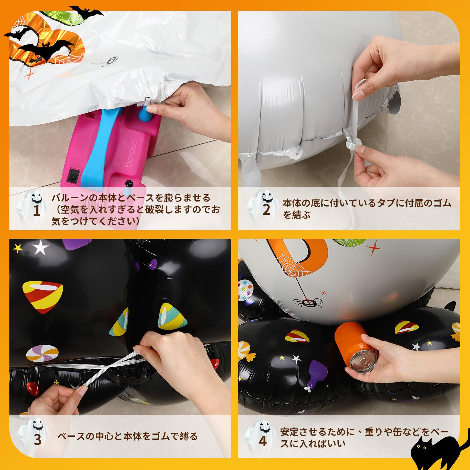 【使いやすい】これらのハロウィン 風船はベースが付いているため、膨らませてから、ベースに固定すれば自立できます。そして、安定して自立させるために、ベース底部に重りを取り付けてください。バルーンには逆止弁がついていますので、入れた空気が漏れず口を止める必要がありません。