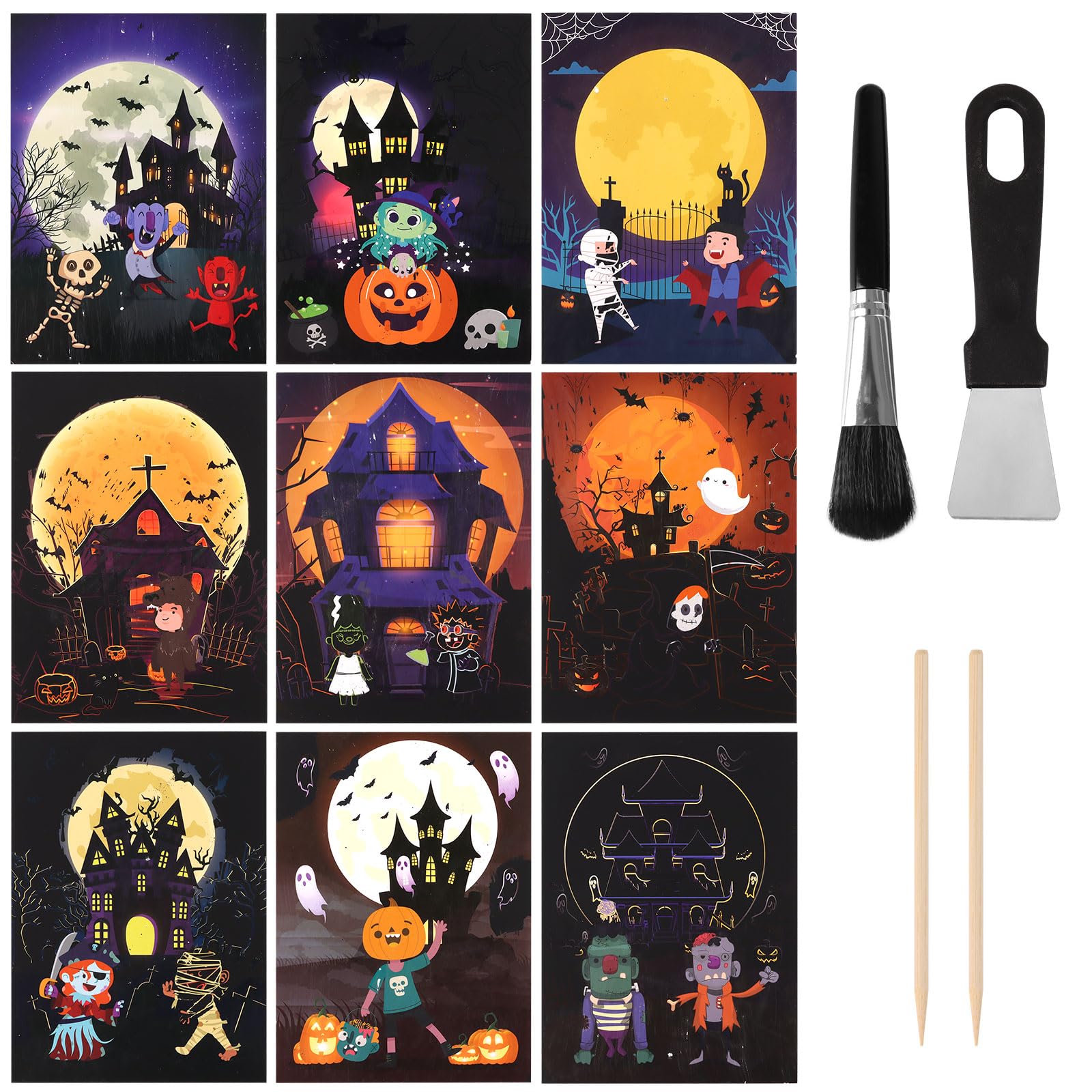 CINECE ハロウィン スクラッチアート 9枚セット 塗り絵 ペーパーアート 専用シャベル1本 専用竹ペン2本付き 無地 虹絵ー 飾り お絵描き DIY プレゼント (ハロウィン)