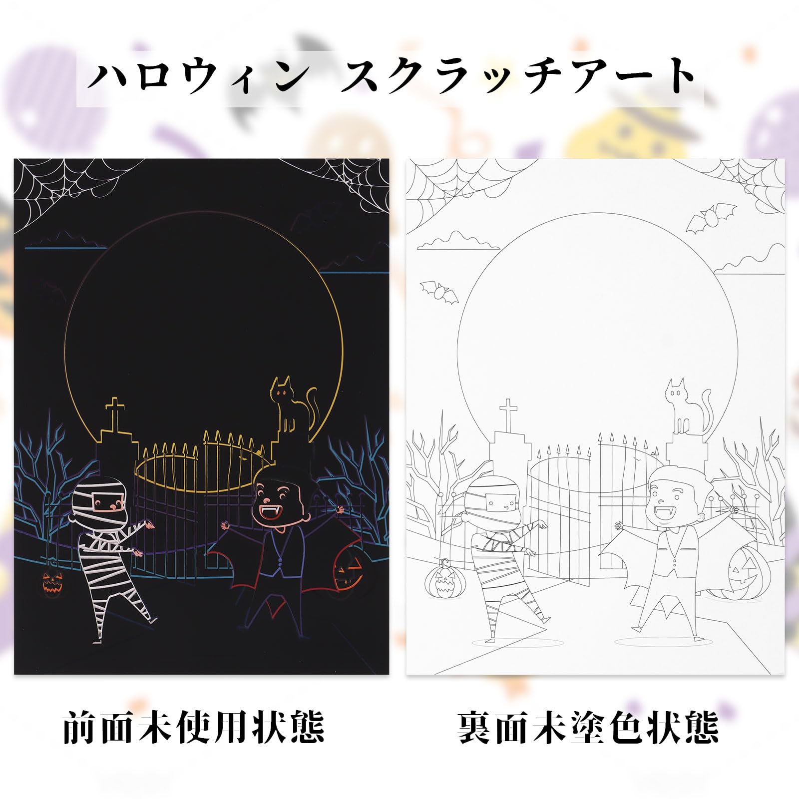 9枚の異なるハロウィン柄:ハロウィンの絵柄が異なる9枚のスクラッチペーパーは、自分で絵柄を描く必要がある普通のスクラッチペーパーよりも簡単で面白く、スクラッチすると思いもよらない艶やかな色彩になり、驚きの連続です!