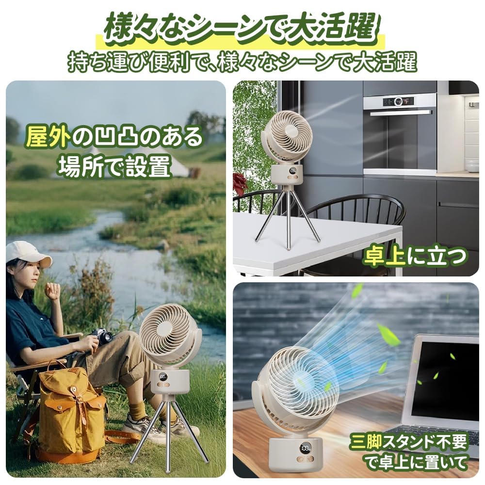 【自動首振り&風量3段階調節&LCD電池残量・風量段階表示】卓上扇風機は自動首振り機能が搭載されて、自由に最適な角度が調整できます。サーキュレーターとして空気の循環にも大活躍!角度は左右自動で120°、手動で上下140°調整が可能です。効率的にお部屋の隅まで風を届け、空気を循環させます。風力は微風、弱風、中風、強風、微風、超強風の3段階で切り替え可能、使用時はお好みに合わせて自由に風量の調節ができます。また、キャンプ扇風機にはLCD液晶ディスプレイが搭載されており、電池残量や風量段階が詳しい数字で表示できるので、残量と段階が一目で確認できます。使うときにバッテリーの残量が無いといった不安を解消します。いつでもどこでも扇風機の残量も充電のタイミングもより掴みやすくて便利です!安心感いっぱい!