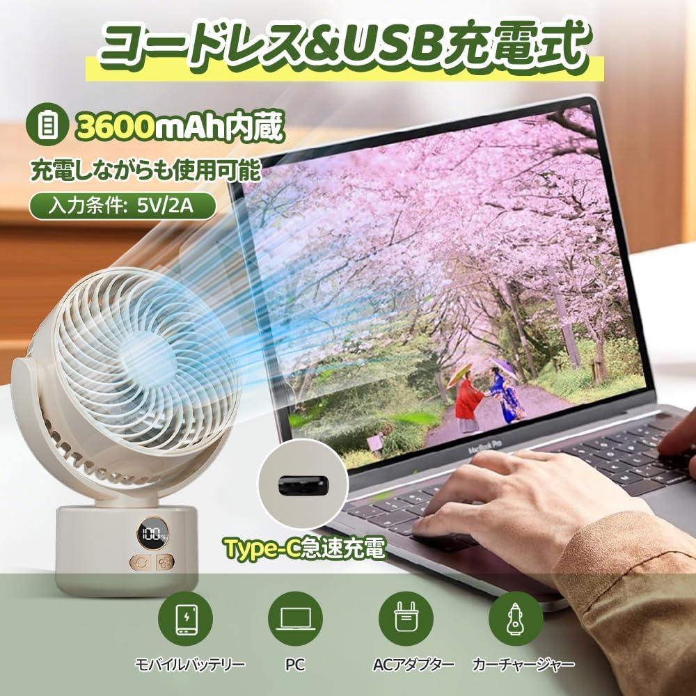 【コードレス&USB充電式&コンパクトで軽量】USB扇風機は3600mAh充電池内蔵し、フル充電後、最小風量で約16時間の連続使用可能、最大風量でも約4時間連続使用が可能です。便利なUSB Type-C端子を採用しており、モバイルバッテリー、カーチャージャー、パソコンやUSB充電器などから楽々に充電できます。また、充電しながらも使用可能、暑い夏を涼しく過ごすことができます。扇風機わずか452gの軽量設計で、片手でも簡単に持ち運び可能。本体サイズは19.5*15.5*9.8cmコンパクトで、卓上や棚の片隅にもすっきり収まります。折りたたみ式の取り外し可能な三脚設計を採用し、コンパクトに収納可能。夏以外の時期はコーナーに片付けてスペースを節約でき、キャンプ、BBQ、スポーツ観戦などにも簡単に持ち運びできます。