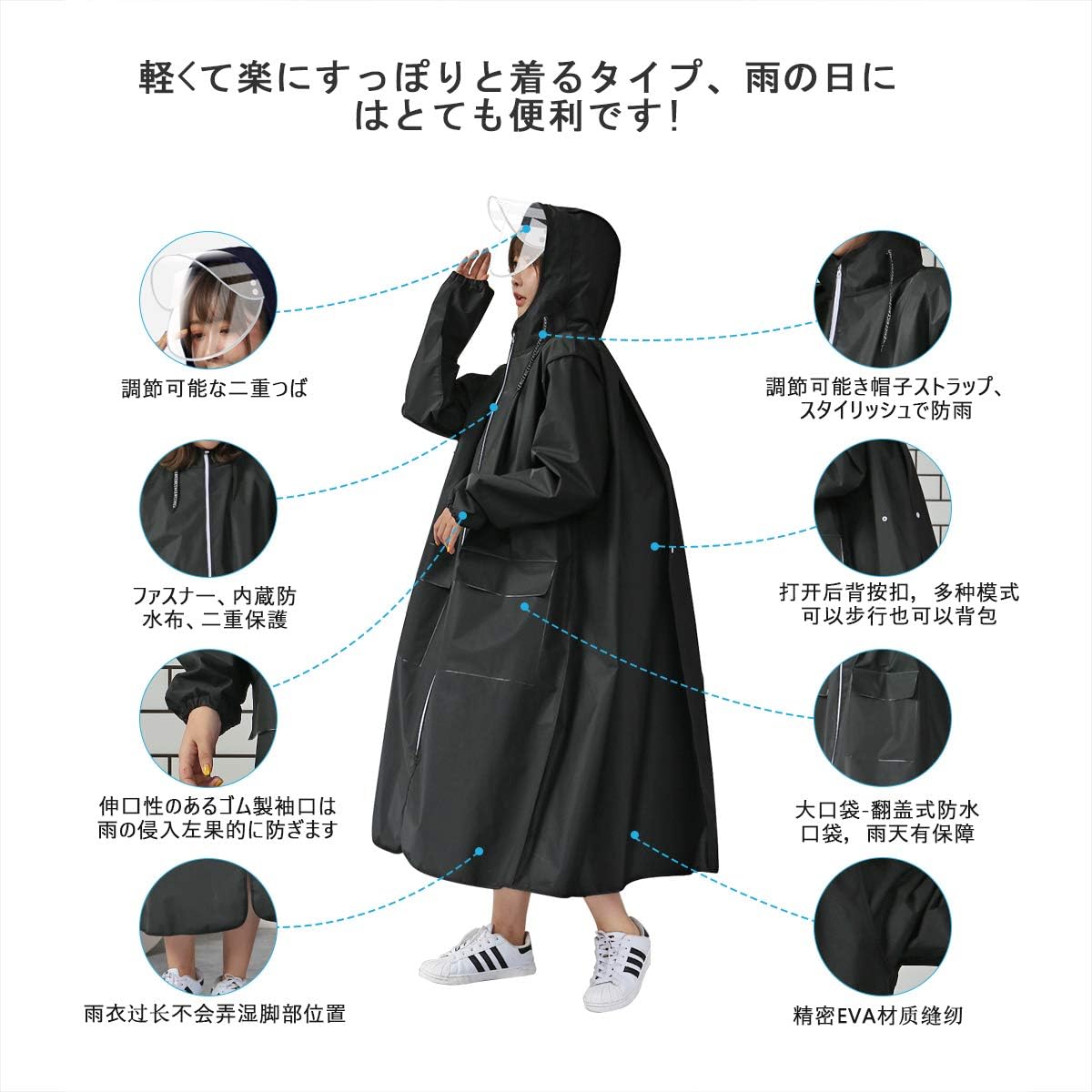 【2025全面最新版、スタイリッシュで実用的なレインコート】緊急雨具はジップカバーを採用しています。安全で着脱が簡単です。一般的な使い捨てのレインコートと違い、長時間の使用が可能です。新しいデザインの概念、美しいファッションです。製品設計、防水、防風、通気、実用性、適合性が全面的にアップグレードしました。3重防水加工もあり、レインコートとしての性能もばっちりです!折りたたむことができ、コンパクトなので、ランドセル/お店/オフィス、車の中など、急な雨が降ったときに使うことができます。