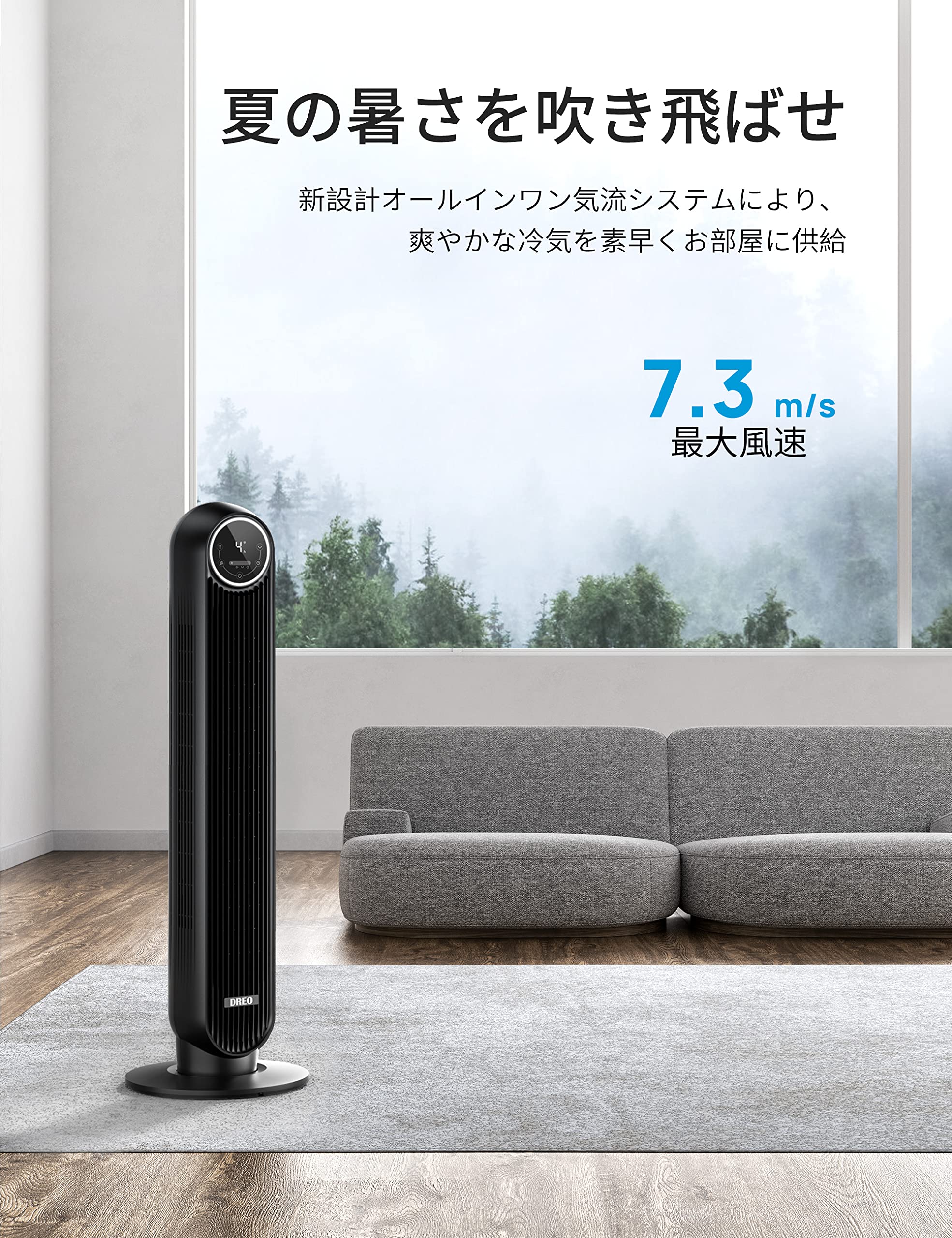 Dreo 扇風機 【2023年最新型】タワーファン 左右90°自動首振り パワフル送風 7.3m/s 風量4段階 LEDディスプレイ 静音 リモコン付き タイマー付き 羽なし おしゃれ グッズ オフィス/脱衣所/寝室/居間用 DR-HTF007