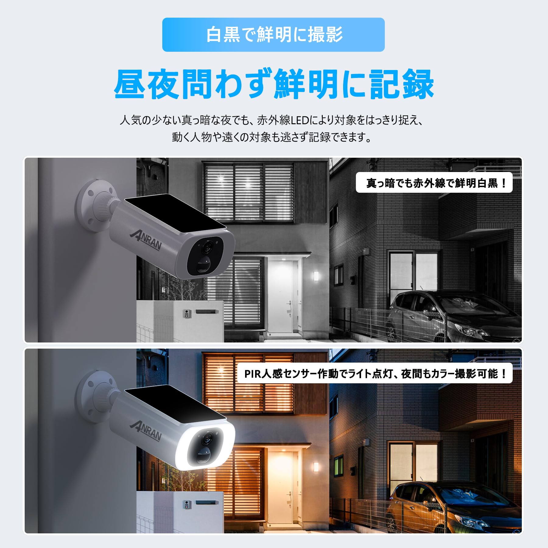 【500万画素●ソーラー一体型●カラー暗視●AI人物検知】ANRANソーラー 防犯カメラは、500万画素の高精度センサーと2880×1620Pの高解像度により、昼夜を問わず、暗闇でもカラーで鮮明な映像を記録できます。AI人物検知機能を搭載しており、犬や猫などの小動物による誤作動を抑制。人を検知したときだけ通知が届くため、無用なアラームに煩わされません。防犯カメラ屋外ソーラーとして、光と警告音で不審者を威嚇。犯罪予防はもちろん、夜間の家族の帰宅確認やお子様の見守りなどにも安心して活用できます。ソーラーパネル一体型の完全ワイヤレス設計で、電源工事は不要。玄関やカーポート、庭など、任意の場所に簡単に設置できます。※ソーラーパネルは効率的な充電のため、定期的に清掃してください。※別途外付けパネルをご希望の場合は、カスタマーサービスまでご相談ください※光や音の警報がご近所に影響する場合は、アプリからオフに切替え、通常カメラとしてもご利用いただけます。