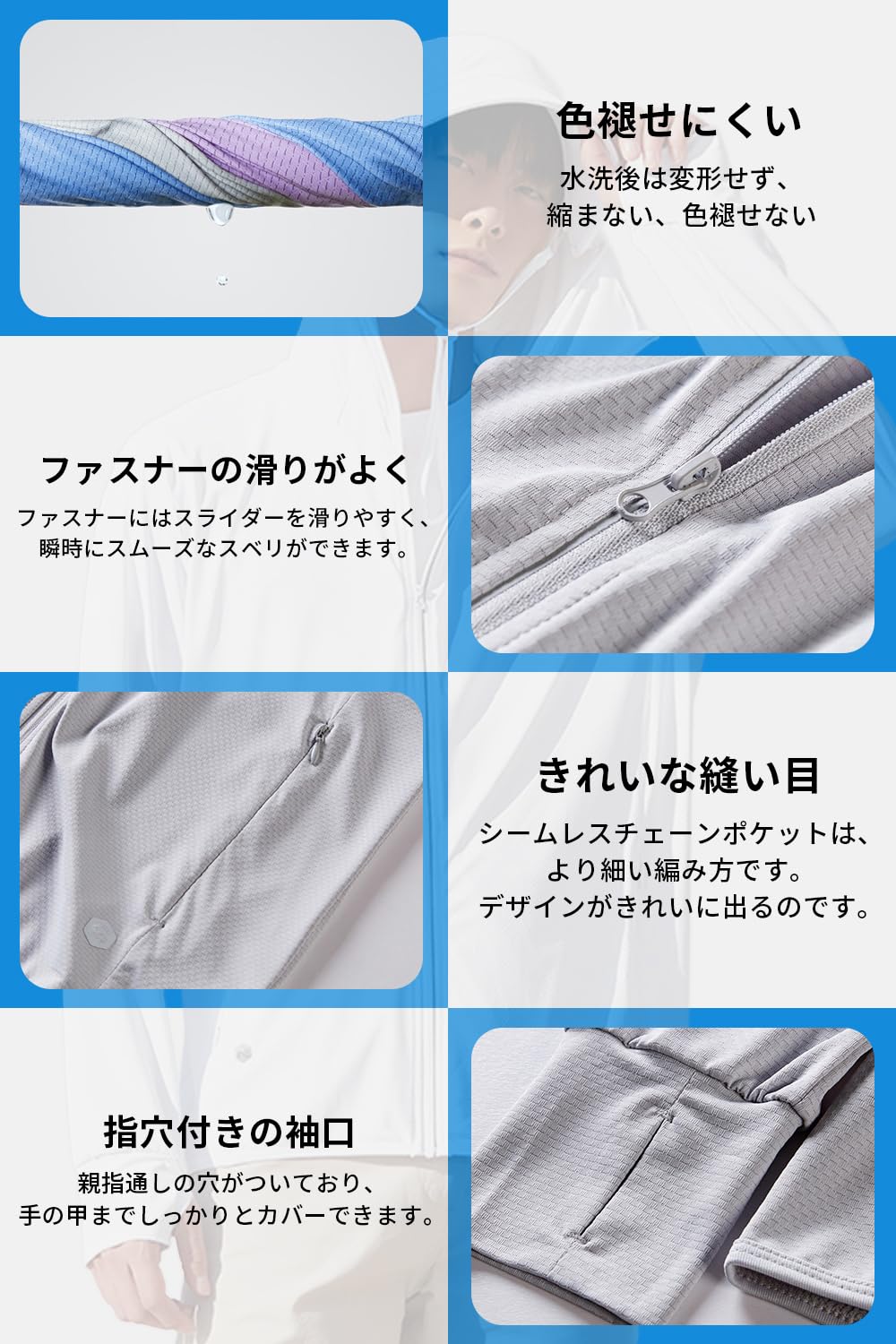 【UVカット日焼け防止対策】UVカット高性能のUPF50+でお肌に有害な紫外線を遮蔽できます。真夏の強い日差しの中でも、焼かない、紫外線からお肌を守るラッシュガードです!シミやシワなど老化させる原因の予防対策に日焼け止めウエアです。指穴付きになったデザインで、手の甲までしっかり覆えるのがポイントです。暑い夏の時期で紫外線対策から日焼けしやすい肌を守ることが重要なuvカット パーカーです。