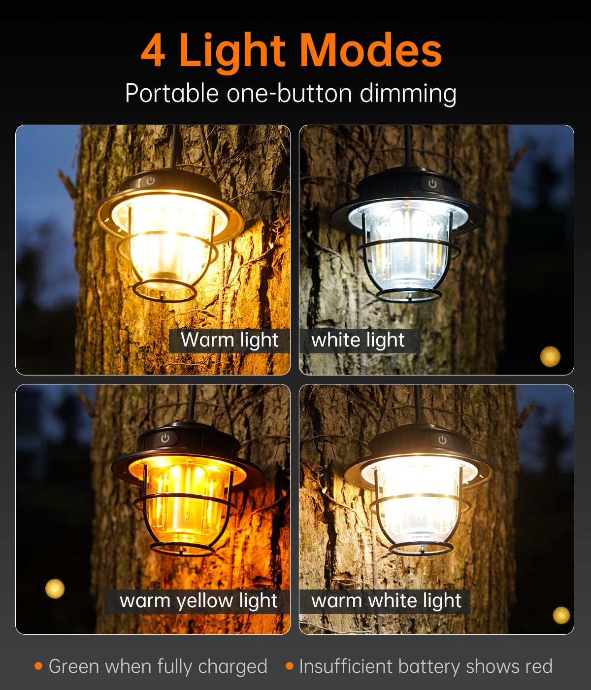 【4色切替、無段階調光】点灯状態で、電源ボタンを短押しして、電球色→昼白色→暖色→自然白を切り替わります。電源ボタンを長押しすることによ り無段階調光調色もでき、ご利用シーンに応じて自由に設置できます。キャンプランタンとして大活躍。