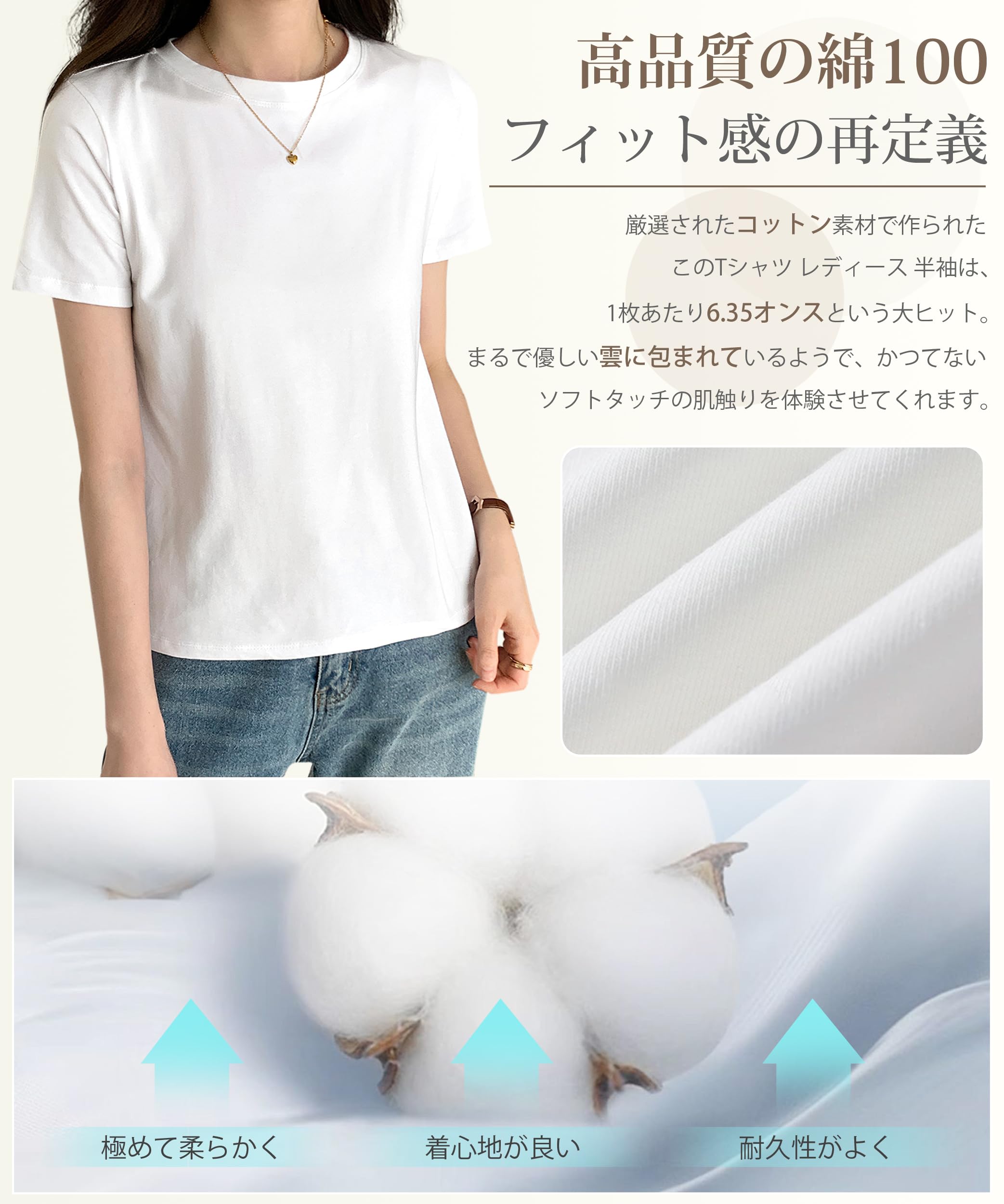 【綿100・フィット感の再定義】 厳選されたコットン素材で作られたこのTシャツ レディース 半袖は、1枚あたり6.35オンスという大ヒット。厚手で通気性の良いテクスチャーは、まるで優しい雲に包まれているようで、かつてないソフトタッチの肌触りを体験させてくれます。優れた快適性と動きやすさで、普段着にもアウトドア活動にも最適。