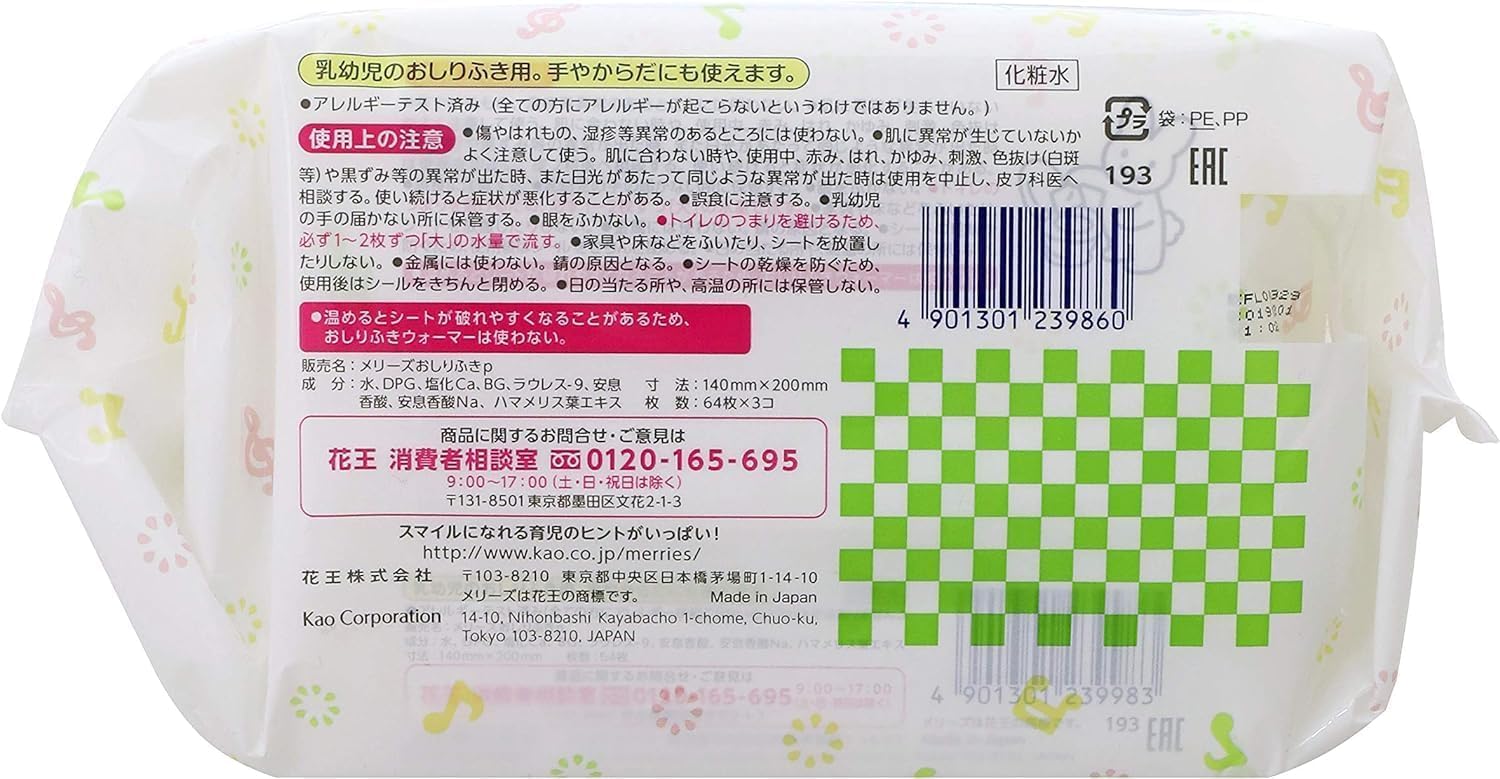 メリーズ おしりふき トイレに流せる するりんキレイ つめかえ用 (64枚 × 3) ×3パック セット