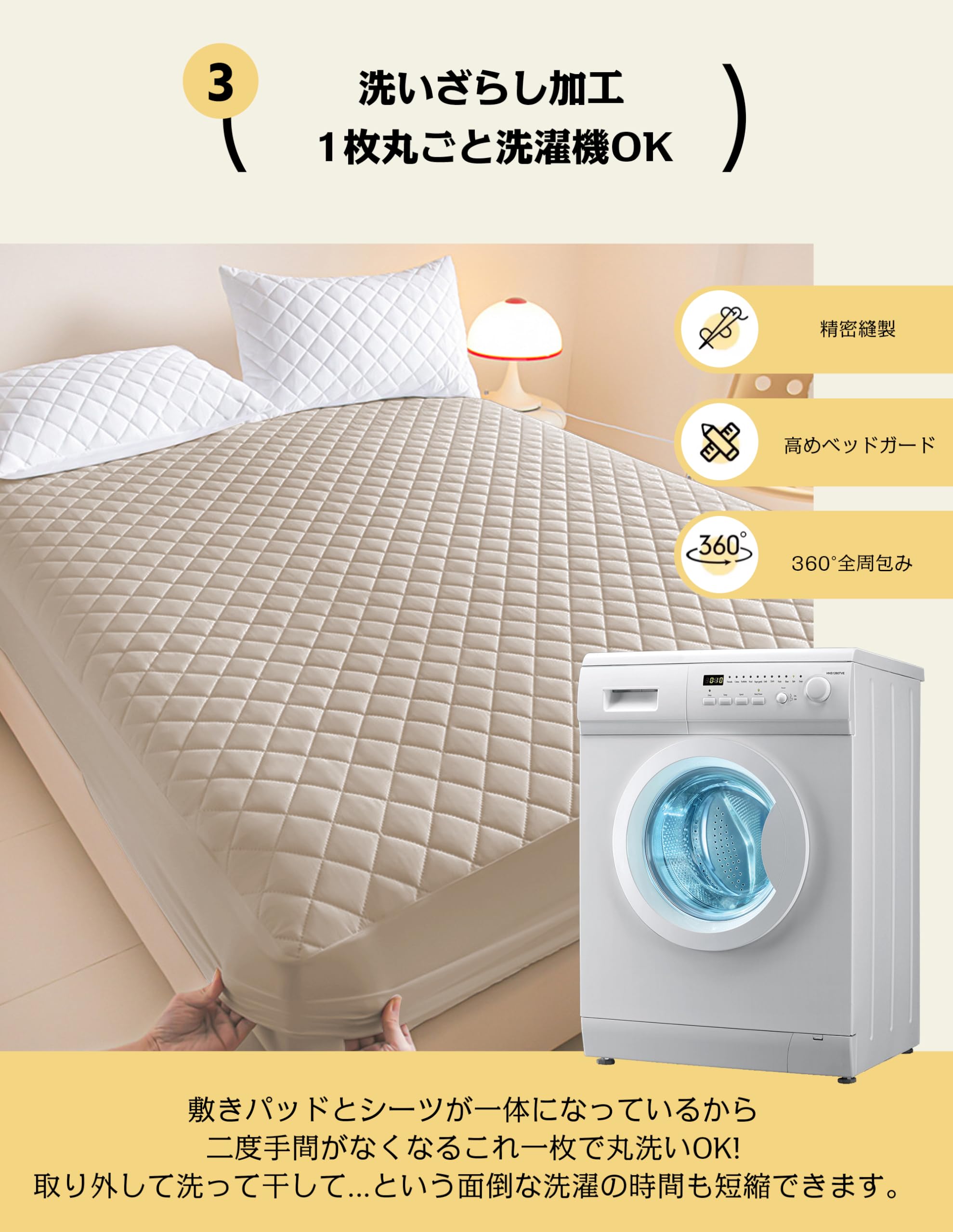 【全周ゴムで簡単フィット】360°しっかりキープ、被せるだけで簡単に装着することが可能。厚さは30cmまで対応なので、マットレス/敷布団にもしっかり固定でき、寝返りしてもズレにくいです。