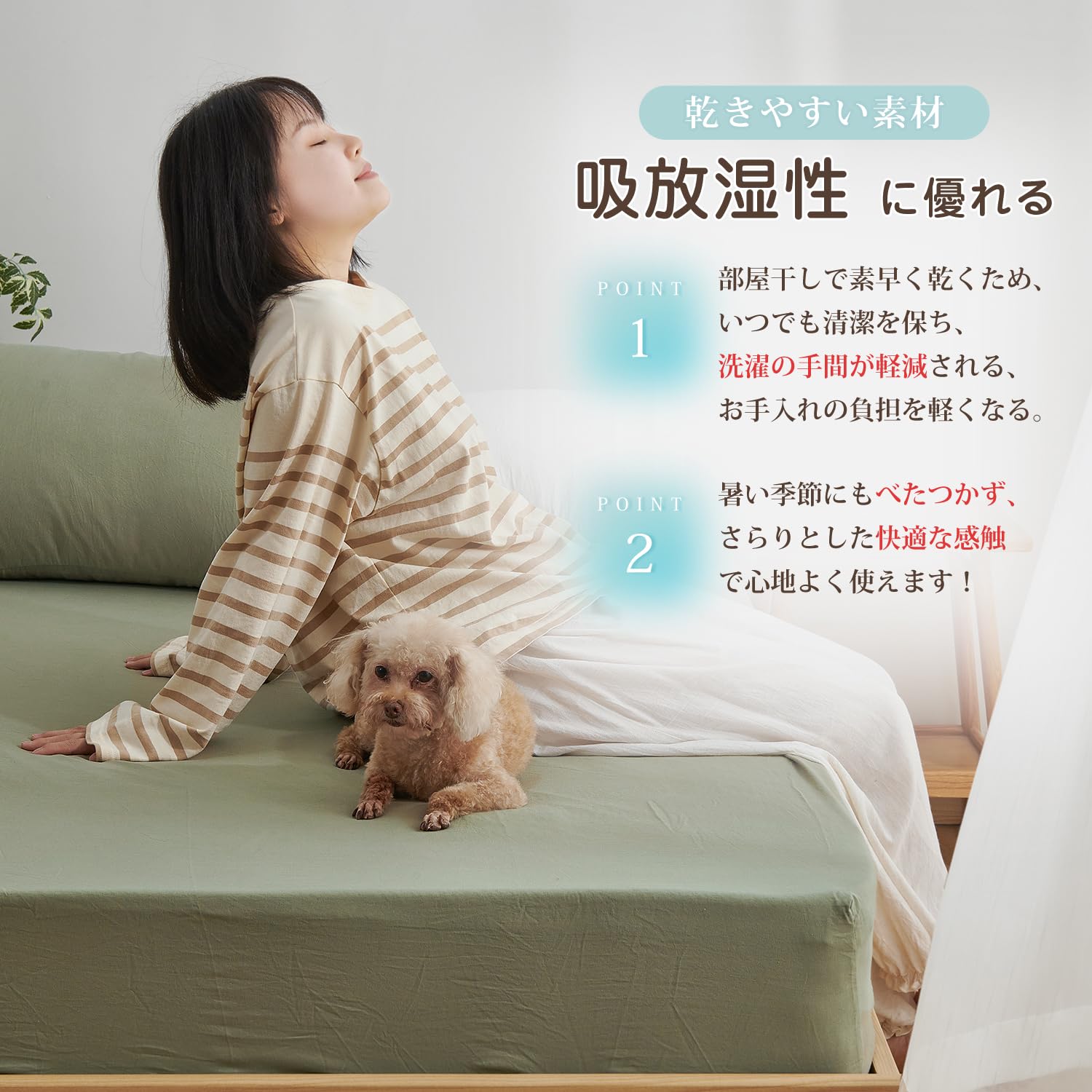 <通気性と速乾性>: 通気性が高いため、寝具の中で湿気がこもりにくく、快適な寝心地を提供してくれます。このボックスシーツは速乾性も優れています。洗濯後に素早く乾くため、洗濯の手間を軽減できますし、清潔さを保ちやすくなります。