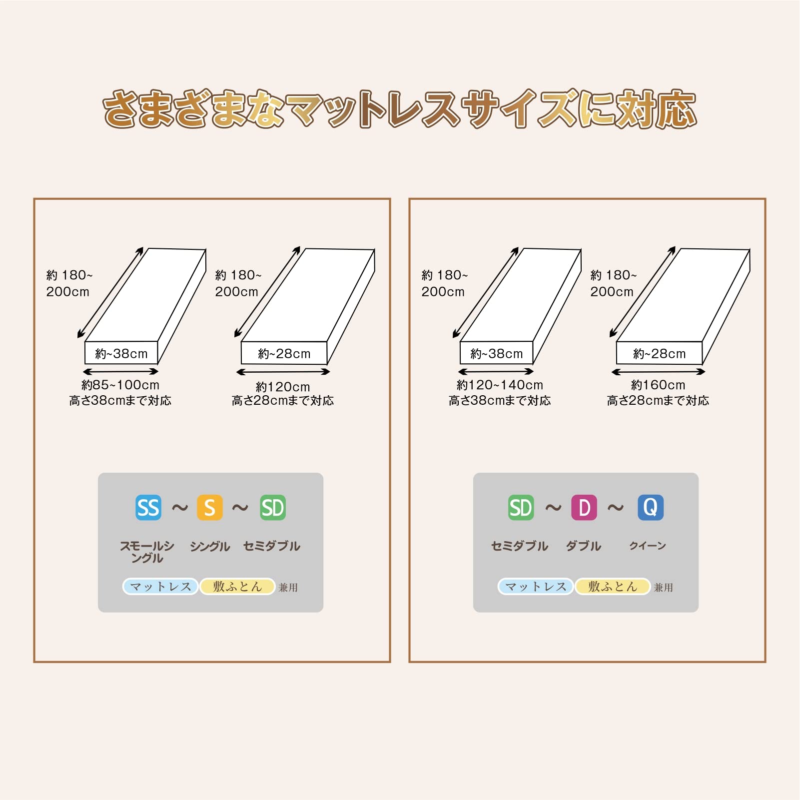 【サイズ】SS-S-SD兼用 約85x180x35cm <br>(85cm x 180~200cm,100cm x 180~200cm,120cm x 180~200cmのベッドに対応可能)<br>材質:ポリエステル 90% ポリウレタン10%<br>弾力性に富みますので、さまざまなマットレスにぴったりフィットします!<br>【適用範囲】<br>【マットレス】対応サイズ: <br>①約幅 85~100cm×長さ 180~200cm×厚さ 38cmまで<br>②約幅120cm×長さ 180~200cm×厚さ 28cmまで<br><br>【敷ふとん】対応サイズ:約幅 85~120×長さ 180~210cm