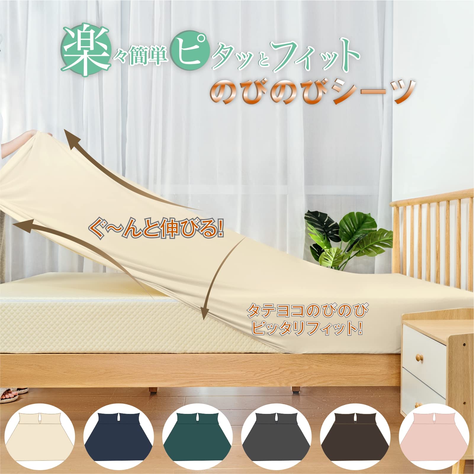 【のびのびシーツ】 伸縮性のある素材を使用し、ぴったりフィットします。弾力性が強くてほぼ自体の2倍で、肌触りがよく通気性も良いです。ポリウレタン混の生地なので伸縮性が高く上下左右自在にぐんぐん伸縮。よく伸びるので手間をかけず簡単に装着可能仕上がりの美しい、綺麗にフィットするシーツを作りました。 最高品質の素材を使用し、豊富で鮮やかなカラーバリエーションは、寝室のインテリアを確実に彩ることでしょう。ベッドシーツはシワになりにくく、色あせしにくいので、毎回アイロンをかけたばかりのような新鮮な印象を与えます。
