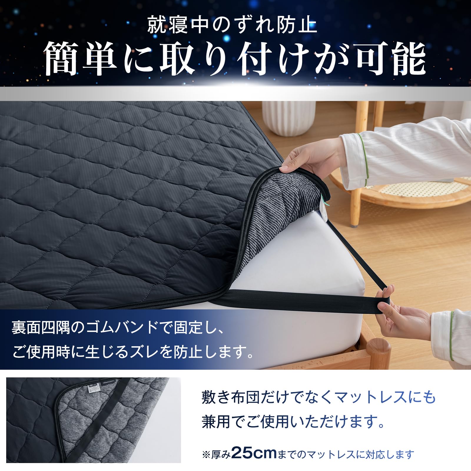 【四隅にゴムバンド付き】四隅にはズレ防止の強化ゴムバンド付きなので、寝返りでもずれにくく、使用中にズレるストレスを軽減します。ベッド/マットレス/敷き布団にしっかり固定して、朝まで安心してお休みいただけます。お手持ちの敷布団、ベッドマットレスに簡単に着脱、取り外しできます。