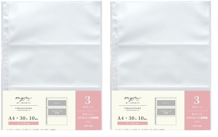 リヒトラブのmyfa推し活チケットは、A4サイズで3ポケットのチケット用スリーブです。ポリプロピレン生地で厚み0.1mm、各ポケットに1枚ずつ収納できます。トップインタイプで、様々なコレクションや小物の整理にも使えます。2つセットで10枚入り、透明でスタイリッシュなデザインです。