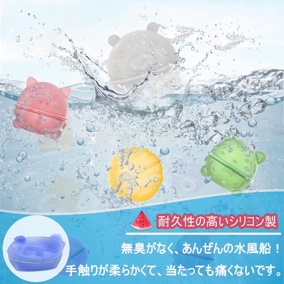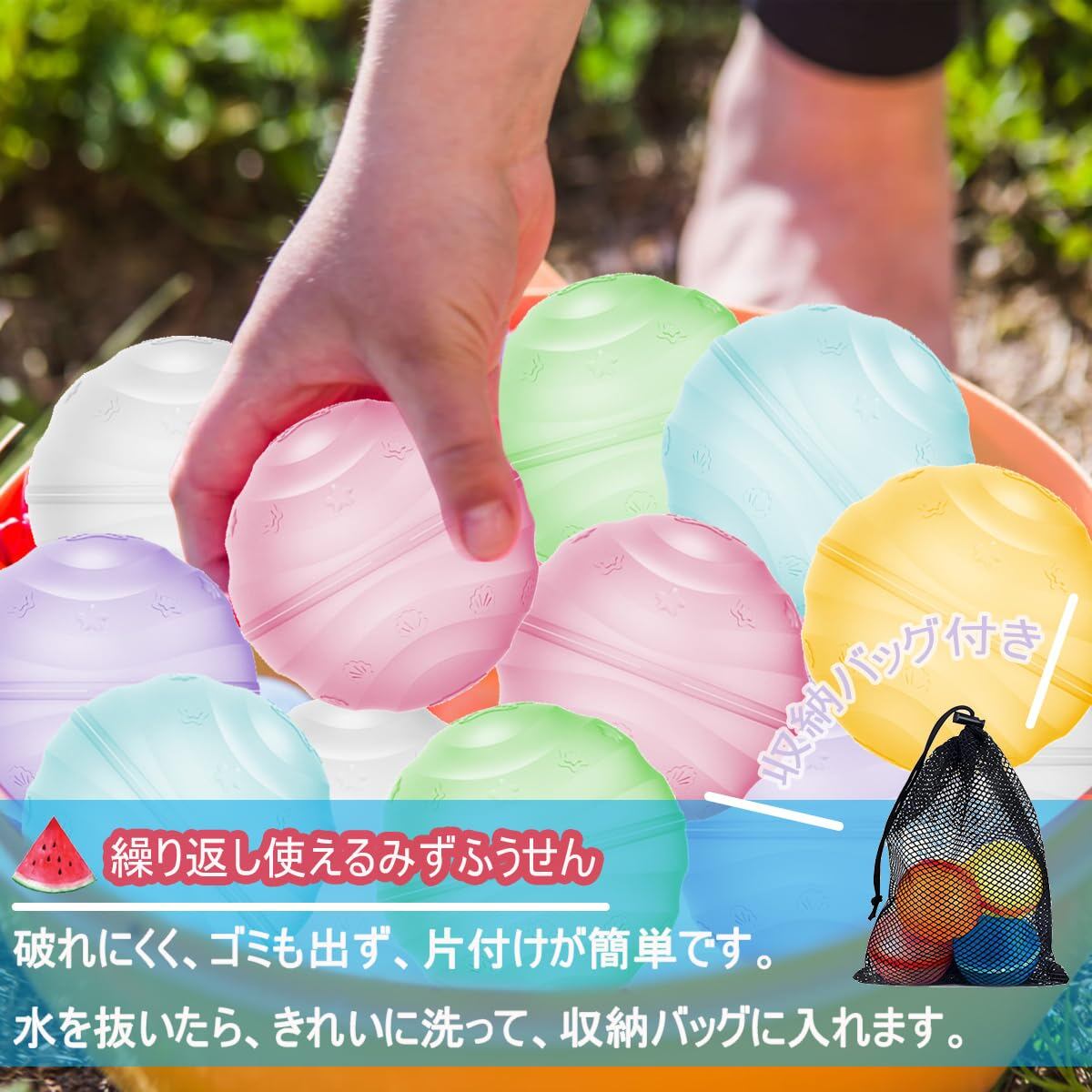【セット】6個入り+収納袋付き 【素材】シリコンです。柔らかなシリコン素材でカプセル状のボールに水を充填するだけ!!割れてしまう一般的な水ふうせんと違い、繰り返し使えるから経済的で片付けも簡単です。子供から大人まで楽しめ、庭やプール、海でも遊べる面白アイテムです!!