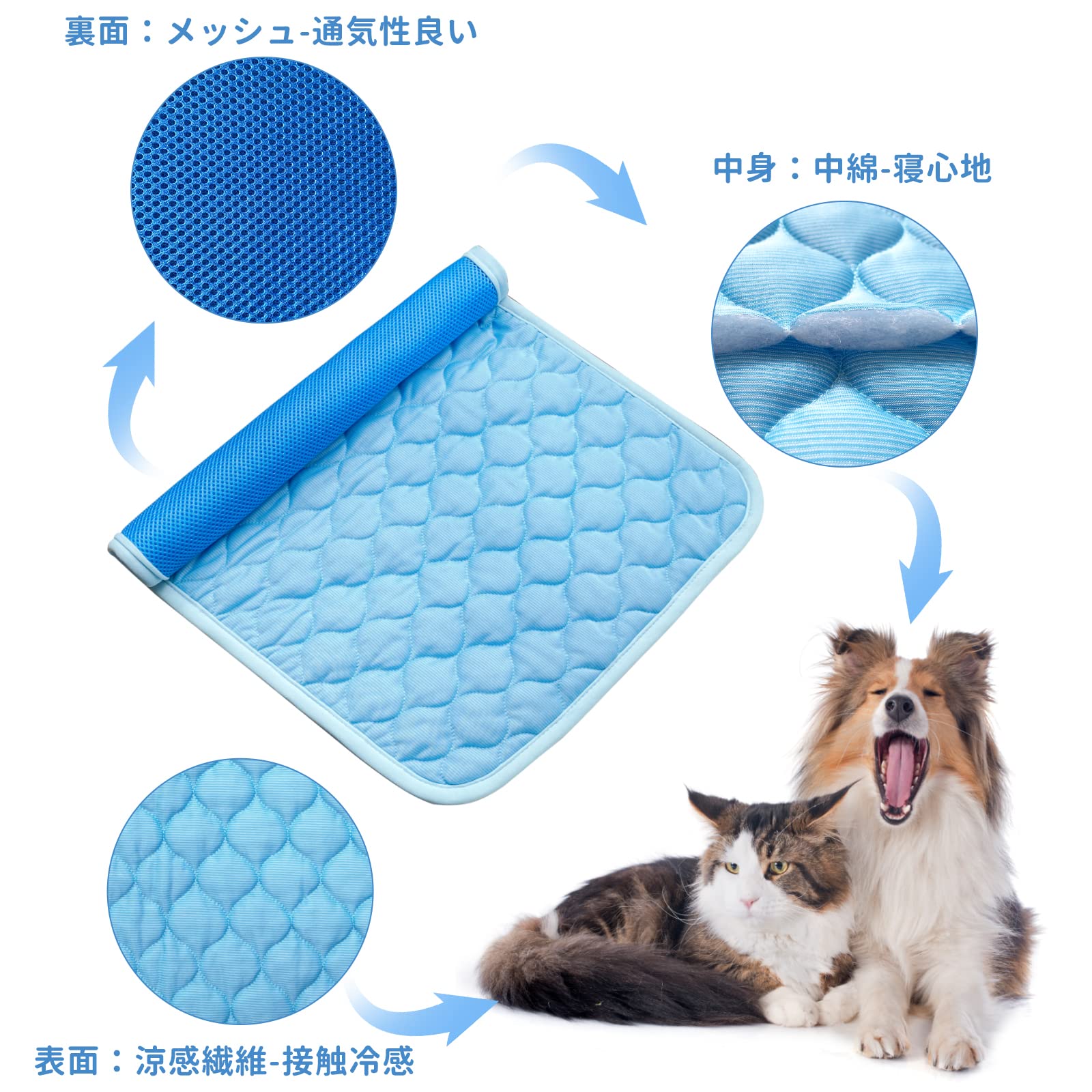 【接触冷感】冷感マットの表面は熱伝導性の高い繊維素材を採用し、裏面は通気性の良いメッシュでペットの熱を吸収することで体温を下げます。暑さに弱い犬や猫にピッタリです。マットはジェルが入れないので、マットをかみちぎってしまっても誤飲の心配がありません。