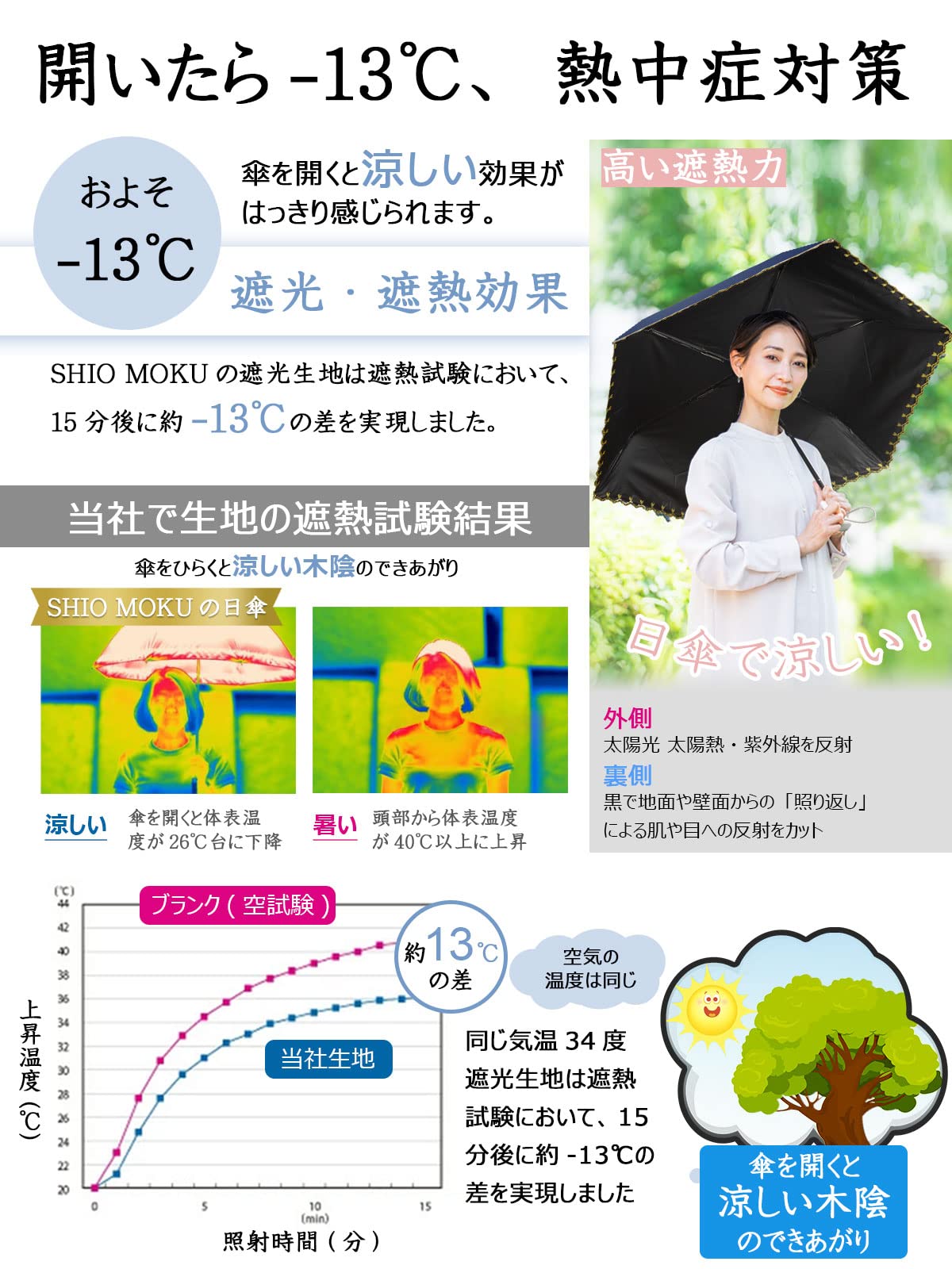 【UVカット100% 遮光日傘が登場!】日焼けをしっかりと防ぐには、日焼け止めの使用だけでなく、効果的な日焼け対策とはUVカット効果の高い素材の日傘も必要です。肌だけでなく髪や頭皮のUV対策にも効果的、SHIO MOKUの日傘は生地の裏にブラックコーティングを施したため、遮光率・UVカット率の高い晴雨兼用傘になりました。遮光率100% 1級遮光を達成しました。