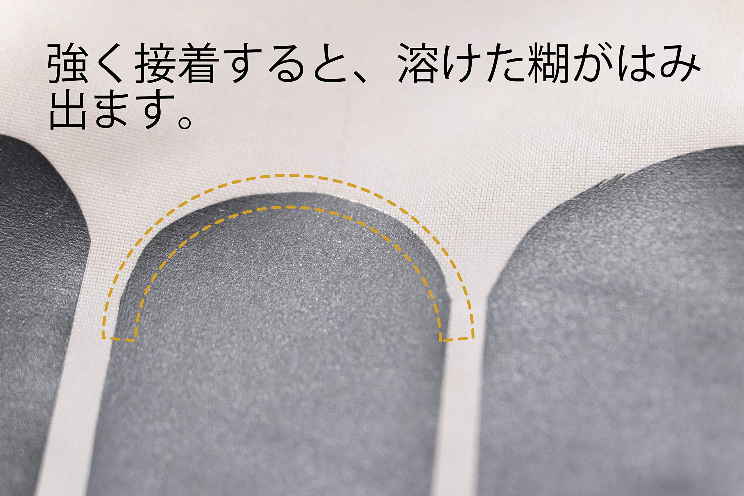 生地の汚れを落とし、当て布を当ててアイロンはドライ設定、中低温程(10~20秒目安)で作業をしてください。アイロンを直に当てると熱により生地が溶けるなどの可能性があります。当て布はご自宅のハンカチなどで代用できます。熱圧着後、冷める時に接着が強まります。