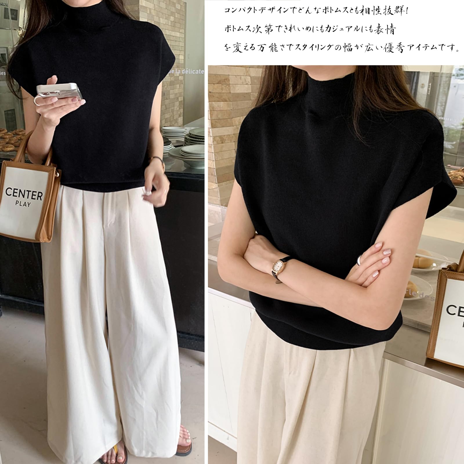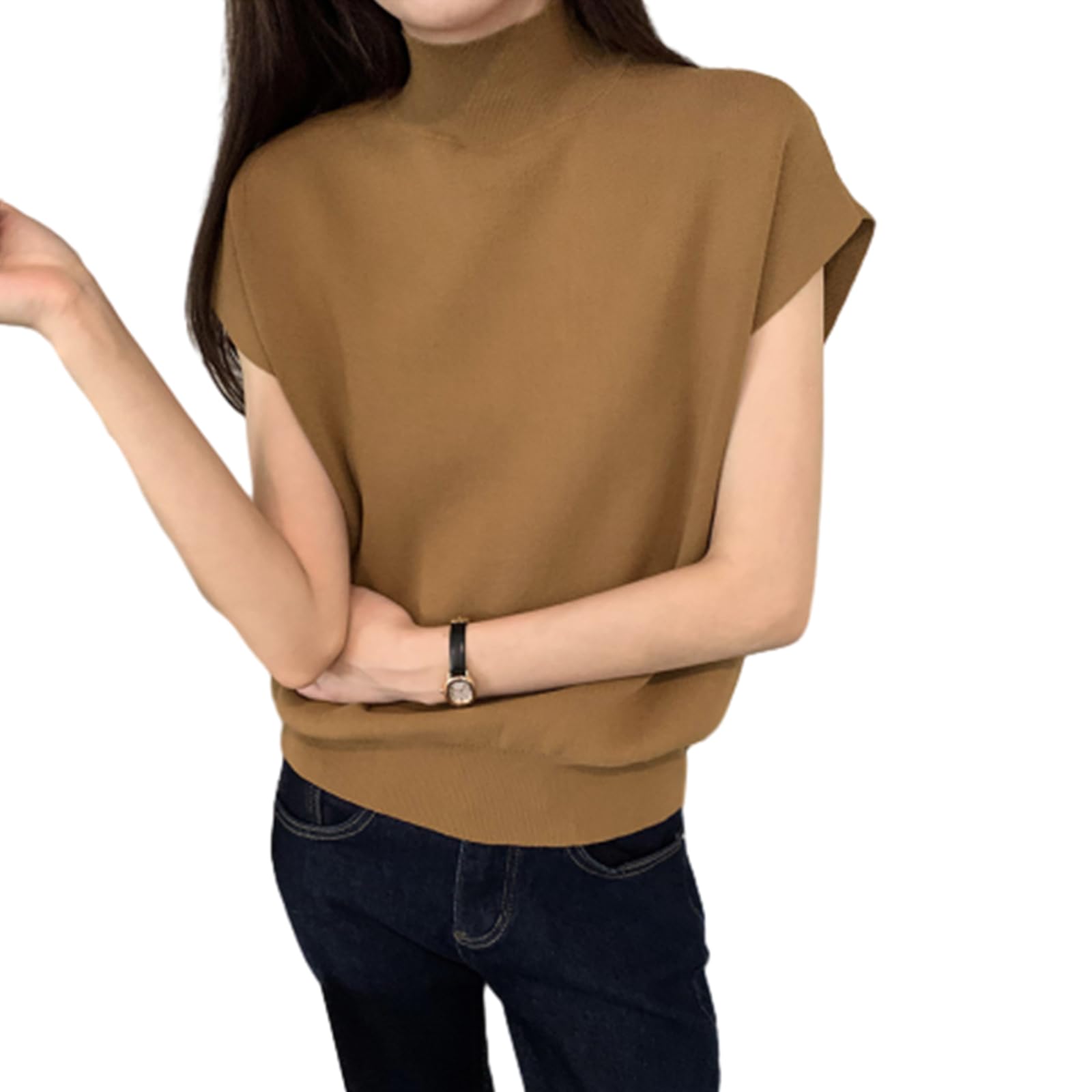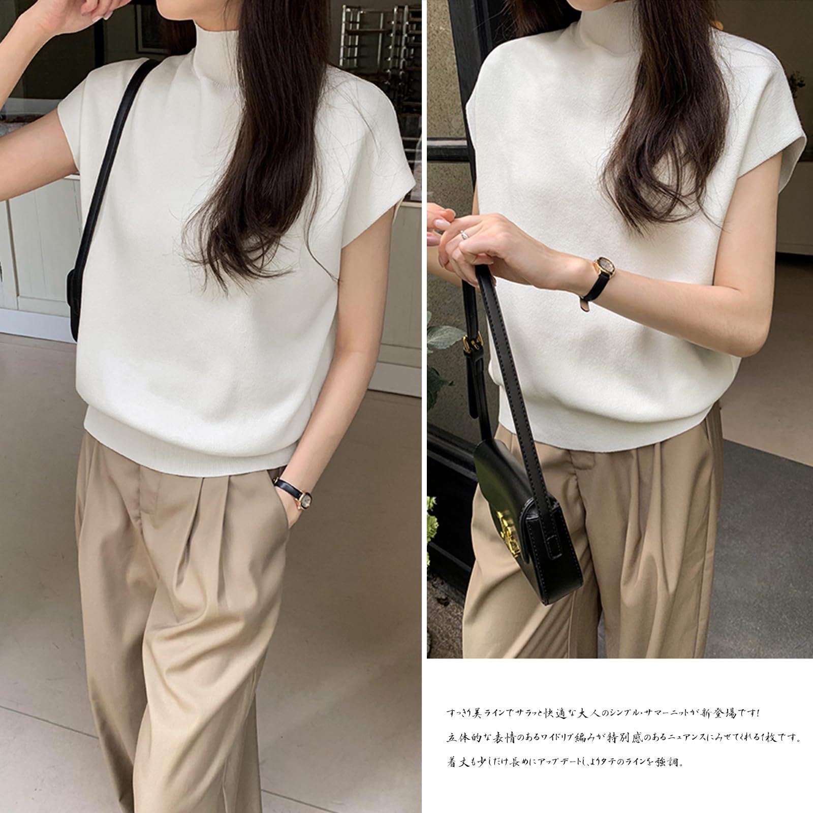 [CCGGOWMM] サマーニット カットソー 薄手 レディース tシャツ ニットソー 半袖 リブ ニット トップス タートル ネック ァッション カジュアル 通気性 無地 体型カバー 着瘦せ ゆったりタイプ 春服 夏服 快適 細見え