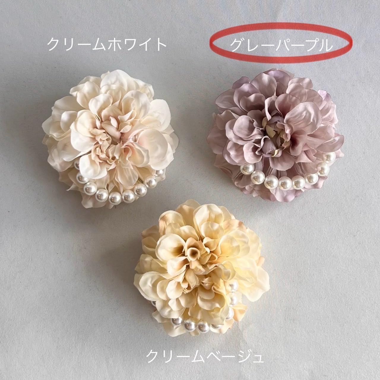 グレーパープル《優しいくすみカラー》のダリアに大粒パールを合わせシンプルかつ上品なデザインに仕上げました。