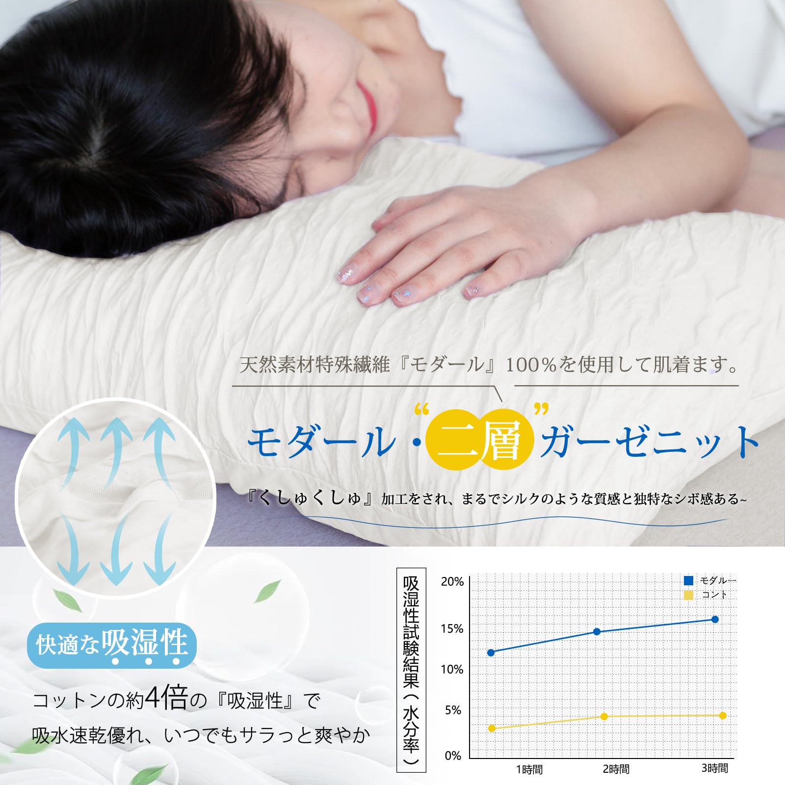 【A面モダール・二層ガーゼニット】枕カバー表が女性用の天然素材特殊繊維『モダール』100%を使用して肌着ます。柔らか、なめらかな肌触り、『くしゅくしゅ』加工をされ、まるでシルクのような質感と独特なシボ感で、ひんやりでやさしくお肌を守ります。
