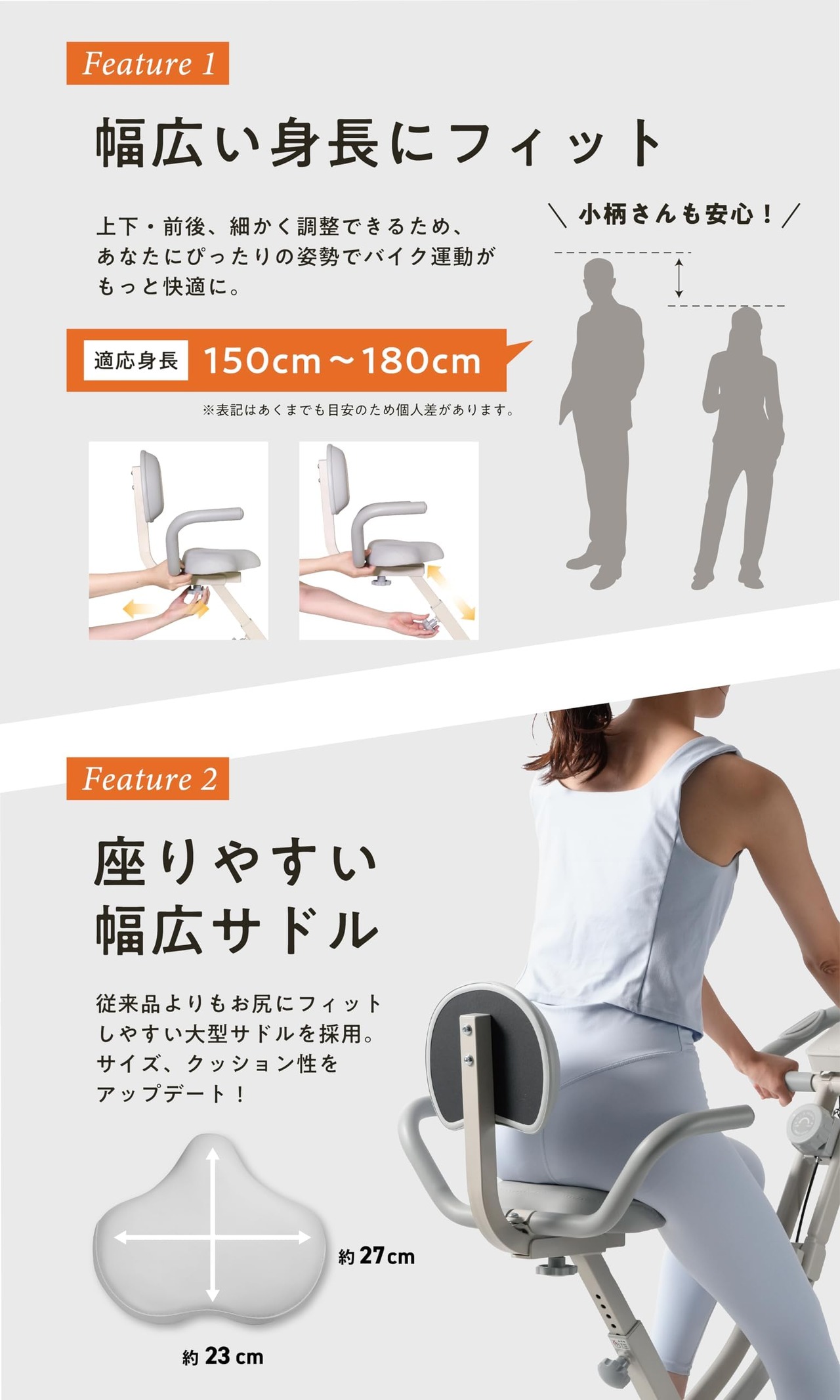 【幅広い体格の方に対応】上下・前後に細かく調節できるサドルで小柄な方にも安心して運動できます。また、身体を支える背もたれシート・大型でお尻にフィットする大型座面シート・お尻にフィットしやすい大型サドルで、楽な姿勢で快適な運動をサポートします。