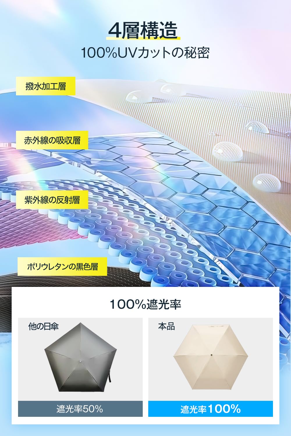 【日傘 UVカット100% & 完全遮光】驚くべき紫外線遮蔽率100%で、紫外線から肌をしっかり守ります。UPF50+の防晒レベルにより、紫外線による肌へのダメージを完全に防ぐことができます。高密度の傘布は、遮熱効果があるだけでなく、遮光率も100%。夏でも冬でも、太陽光には常に紫外線が含まれているため、この日傘は一年を通じて欠かせないアイテムです。