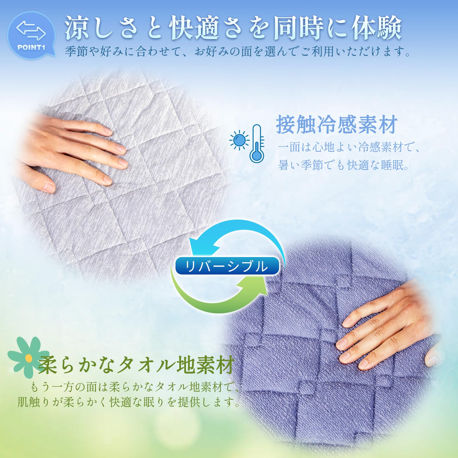 【ダブル機能リバーシブル設計】 ▶冷感面:ナイロン配合特殊加工でひんやり持続 「接触冷感+熱伝導+放熱」のトリプル冷却効果。 ▶タオル面:高密度織りで吸湿保温 春秋季は柔らかな肌触りで保温性を発揮。吸水量通常品比150%の速乾性能で寝汗を瞬時吸収。