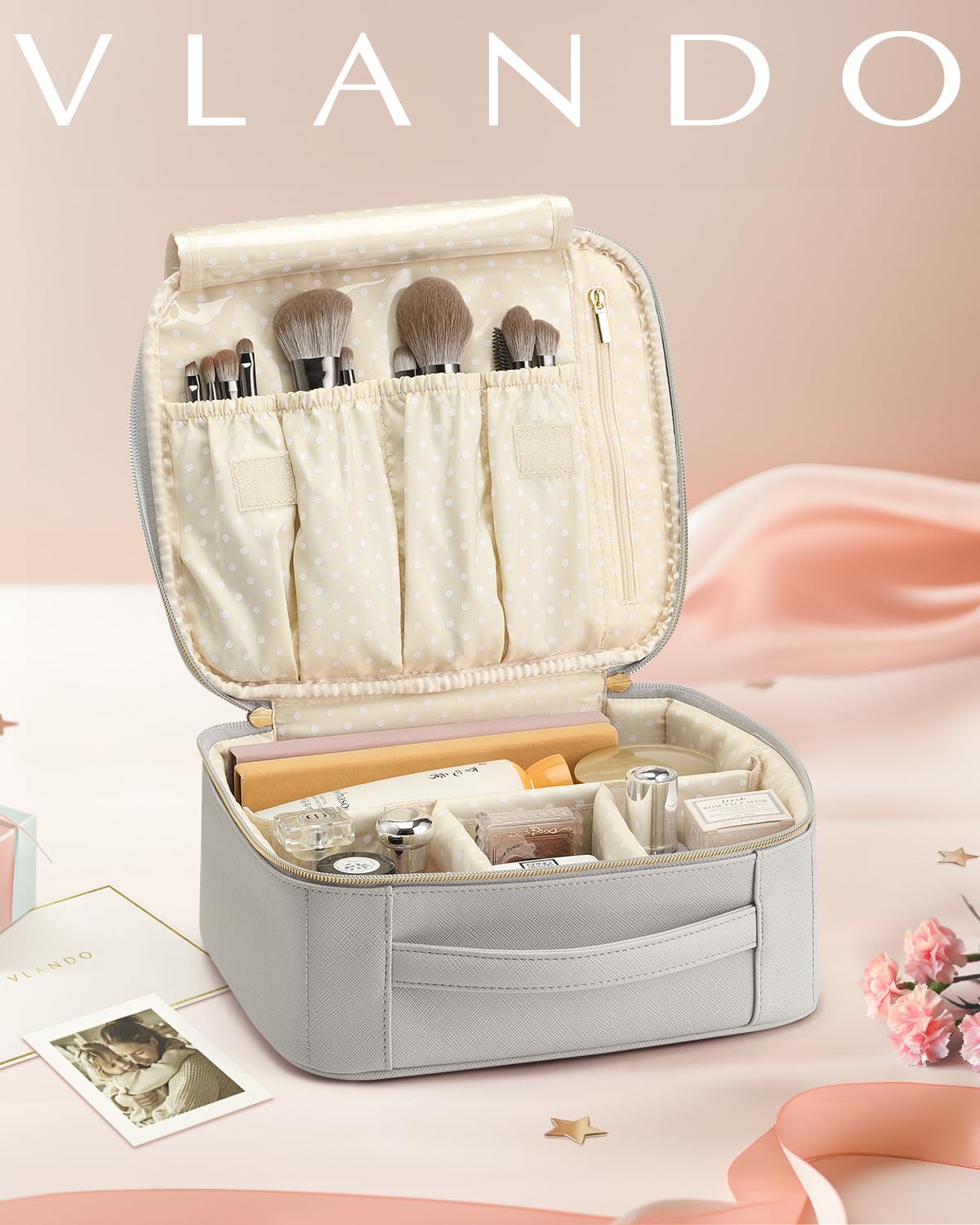 Vlando メイクポーチ メイクバッグ 大容量 化粧品収納ポーチ プロ用 コスメ収納ボックス ブラシ 入れ付き 可调节 仕切り付き 多機能 旅行用 防水 持ち運び (グレー)