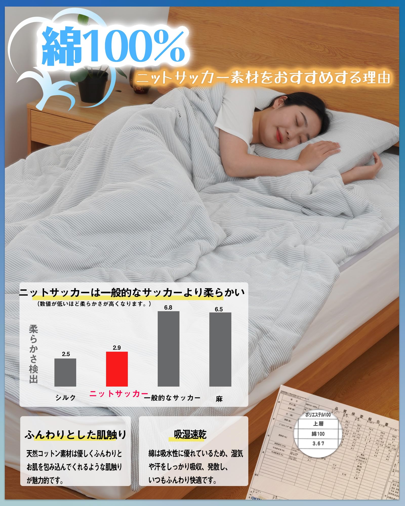 【さらさら綿敷きパッド 】柔らかなニットサッカー素材を贅沢に使用し、最新の技術で織り上げた夏用 敷きパッド。その心地よい触感はまさに至福のひとときを約束します。内部には抗菌性に優れた帝人中綿を厳選し、清潔で健康的な睡眠環境を提供いたます。柔らかい手触りと優れた通気性を持ち、身体を快適な温度に保ちます。リラックスした眠りを追求する方にぴったりの選択です。