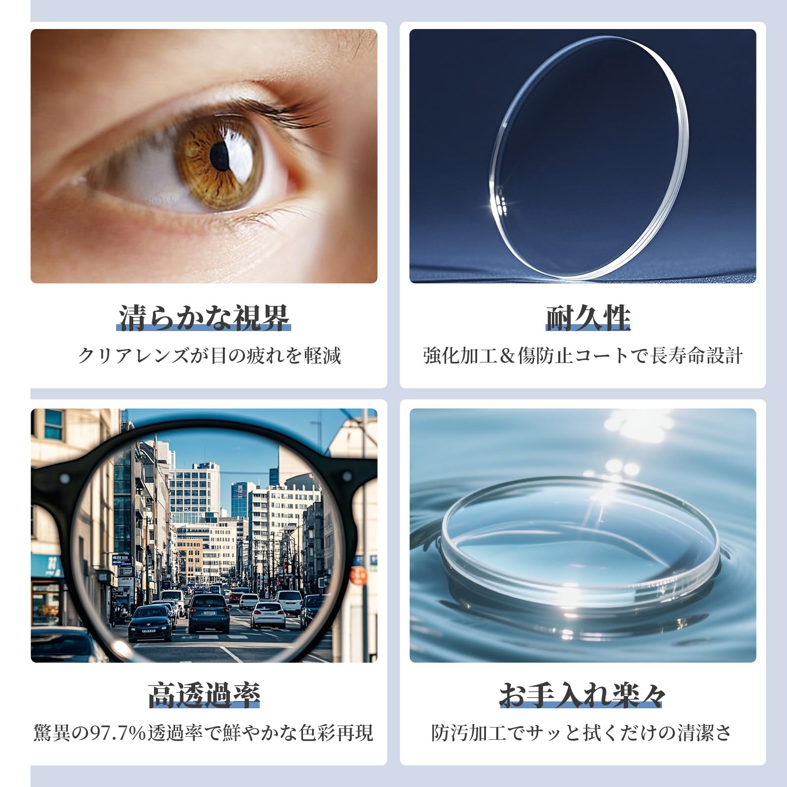 【防ブルーライトの超清樹脂レンズ】当製品のレンズは、最先端の防ブルーライト技術を搭載した超清樹脂製です。現代社会に欠かせないスマートフォンやパソコンなどの電子デバイスから発する有害ブルーライトを有効に遮断し、視界を保護します。長時間のデジタルデバイス使用後の眼疲労や目の乾燥感を軽減し、より健康な視覚体験を提供します。